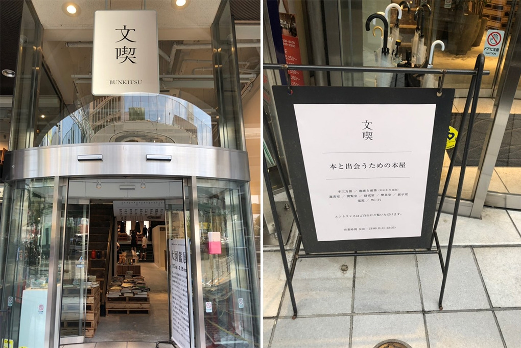 분키츠는 한자로 ‘文喫(문끽)’, 해석하면 ‘글(문화)을 만끽한다’는 뜻이다. 특이한 점은 서점인데 입장료를 받는다는 점이다. 서점 입구에 입간판이 있는데 이런 문구가 쓰여 있다. ‘책과 우연한 만남을 위한 서점(本と出会うための本屋)’. 입구를 지나면 전시장이 있고, 전시장을 지나가면 90여 종의 잡지가 보인다. 그리고 서점 안에서는 차도 마시고, 업무용 회의도 하고, 일도 할 수 있고, 식사도 하면서 하루를 보낼 수 있다. 실제로 서점 안은 서점이라기보다는 복합 문화 공간의 기능을 하고 있다.