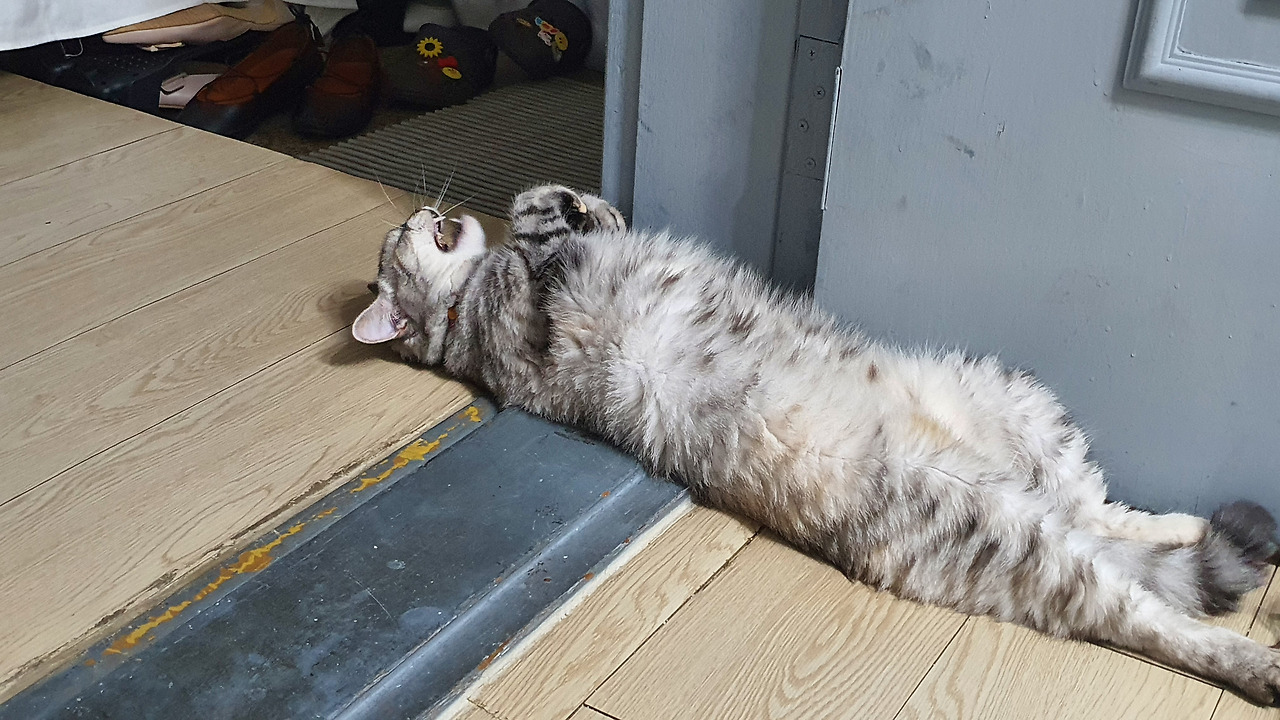 그럼에도 나는 바로 오월이를 쓰다듬지 않았다. 집안에서 사는 오월이에게 바깥 병균을 묻힐까 봐서다. 그래도 가끔은, 아주 가끔은 자다가 눌린 얼굴 그대로 마중 나오는 오월이를 보고 귀여움을 참지 못해 쓰다듬을 수 있었는데 지금은 절대 불가다.
