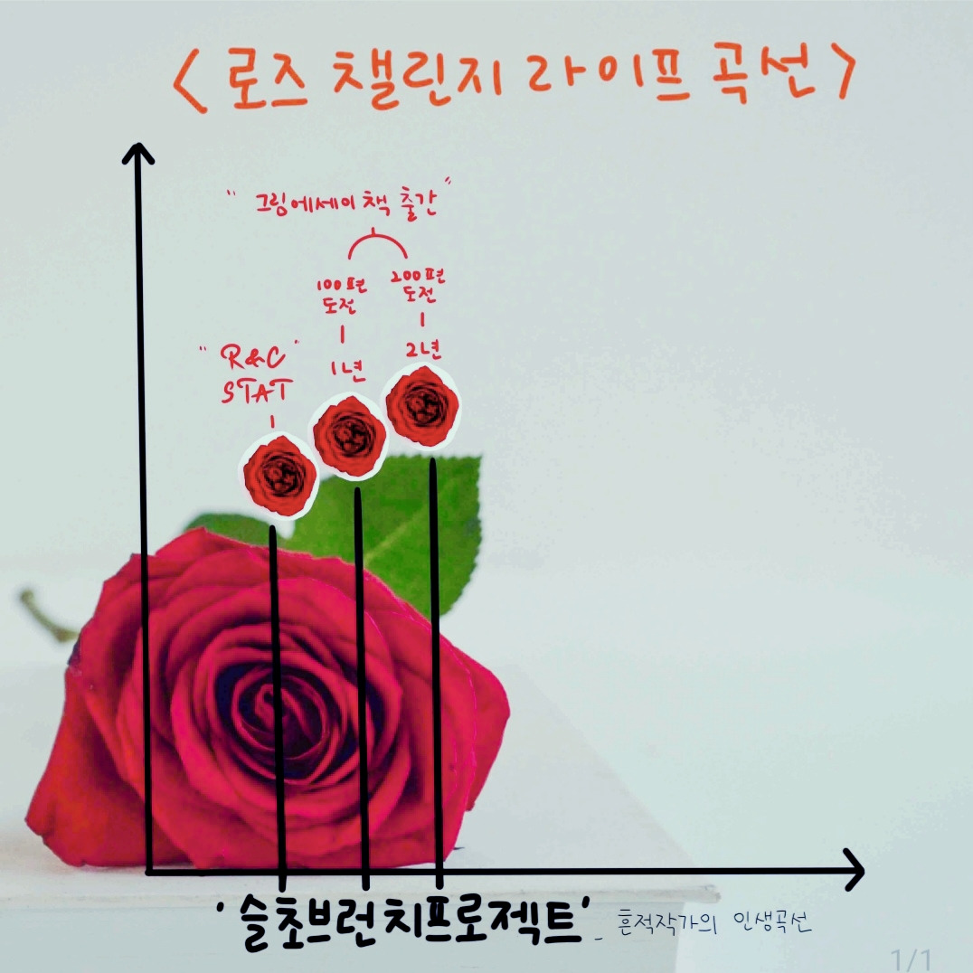 정리하면. ‘슬초 브런치프로젝트’ 이전의 삶은 목표 없이 변화를 바라며 동동 거리 던 시기였습니다. 하지만 그 이후부터는 목표를 세우고 도전하는 삶을 살기 시작한 시기입니다. 정말 딱 한번 내본 용기가 많은 변화를 만들어내고 있습니다. 인생의 곡선이 바뀌고 있으니 말입니다. 저의 인생의 곡선은 이제 막 바뀌기 시작했기에 인생의 성패를 판단할 수는 없습니다. 하지만 김영하 작가님이 우리 인생의 성패를 판단하는 곡선은 하나가 아닐 수 있다고 했습니다. 그러니 하나의 곡선에 도전하다 실패해도 괜찮습니다. 다른 곡선이 있으니깐요. 그래서 저는 저의 인생 그래프를 표현할 곡선의 이름을 ‘로즈 챌린지 라이프 곡선’이라고 부르기로 했습니다. 도전을 많이 해서 곡선이 정신없을 수는 있겠지만 멈춰버린 인생 곡선은 원하지는 않기에 조금 정신없는 것은 디폴트로 가져가려 합니다.