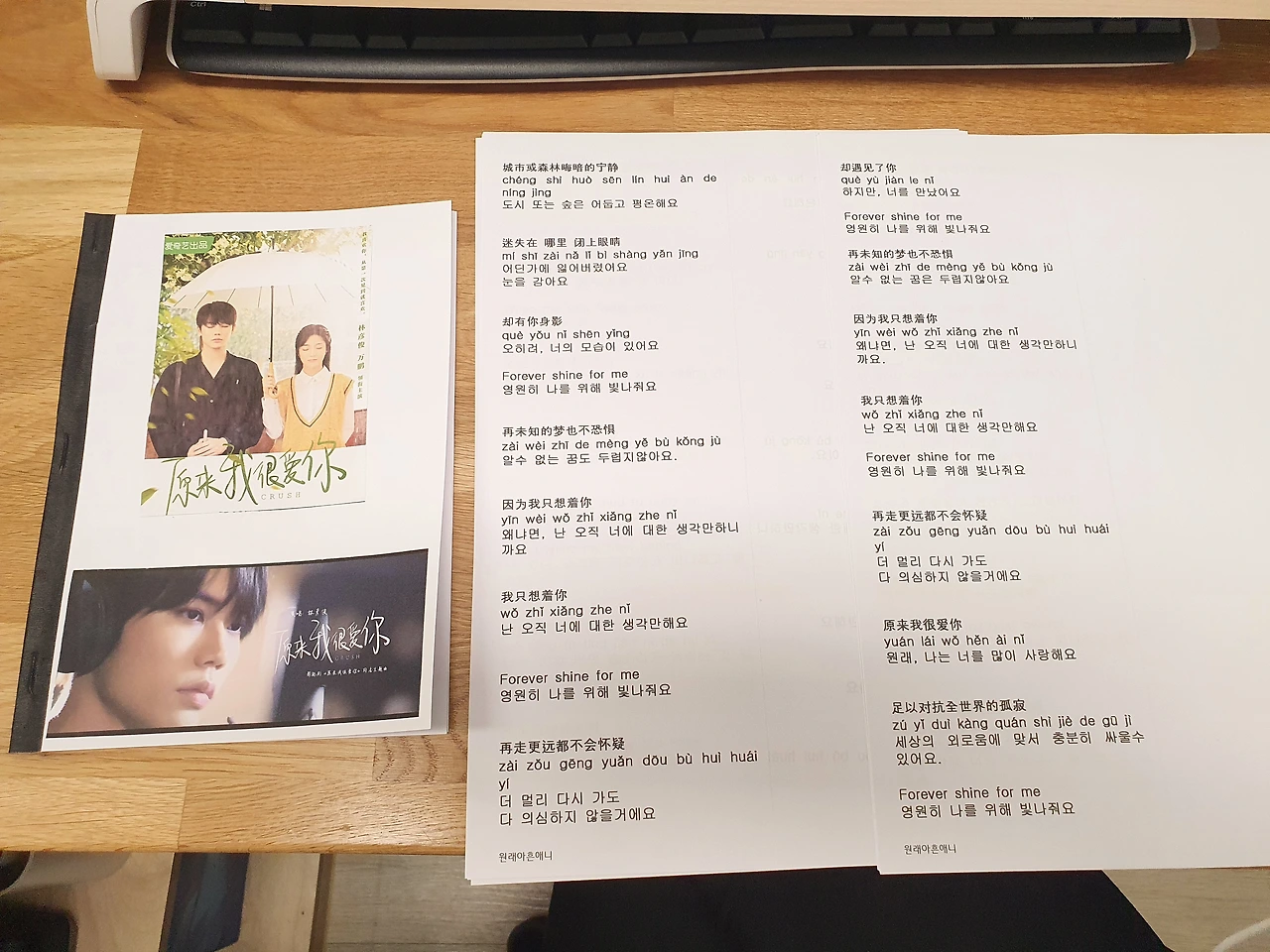 덕질 좀 하세요. 아이에게 하는 덕질 말고요. 남편에게 하는 덕질 말고요. 온전히 나를 위한 떨리는 마음을 만드세요. 그게 저는 드라마에 나오는 남자 주인공이에요. 오, 당당해졌다. 좋아. 한 발 더 나가자. 폭풍 검색을 시작한다. 이제는 OST 원래아흔애니의 가사와 가사 해석본이다. 웹 페이지를 넘기고 넘겨서 딱 내게 원하는 것을 찾았다. 감사의 댓글을 달고 가져온다. 역시 한글 프로그램에 글씨체와 크기를 바꾸고 줄 간격도 다시 맞춘다. 갑자기 남편이 생각난다. 본인 컴퓨터를 어찌나 잘 정리하시는지 폴더가 나란히 나란히 정리되어 있다. 집안일을 그렇게 아니, 본인 방을 그렇게 하면 좋을 텐데. 항상 이렇게 생각했는데. 잘못했네. 남편에겐 컴퓨터가 로망인가 보다. 그래 내 로망이 중요하면 남편 로망도 중요한 거지. 로망 찾다가 인내심과 반성, 용서까지 가는구나. 우선 내 덕질이나 잘해야겠다. 가사는 중요하니깐. 타다닥 타다닥. 열심히 가사집을 편집하고 출력 시작. 예쁘게 꾸미고 짠 사진을 찍어 친구한테 전송한다. 역시 덕질은 가사집부터다.
