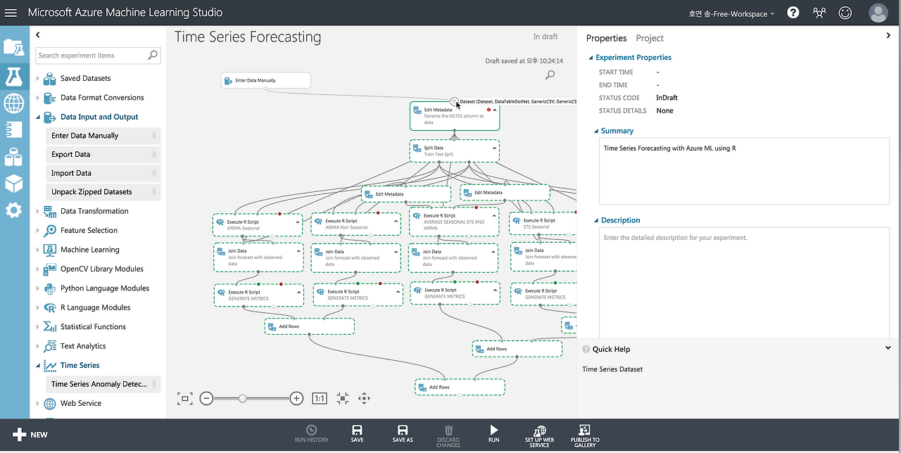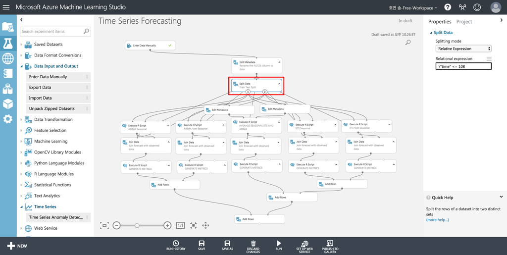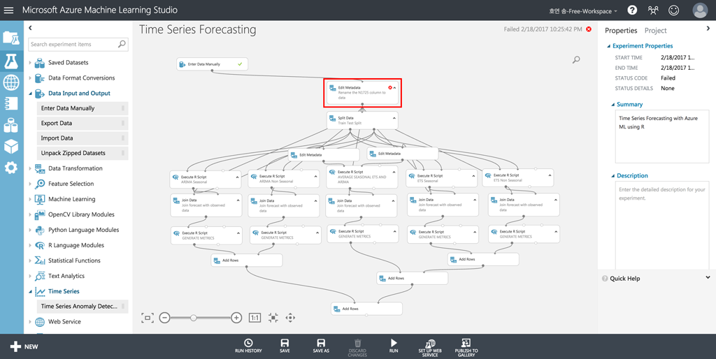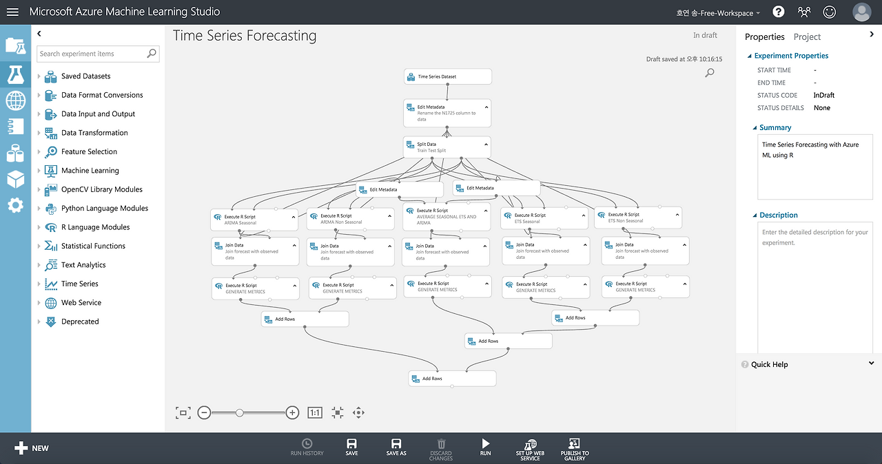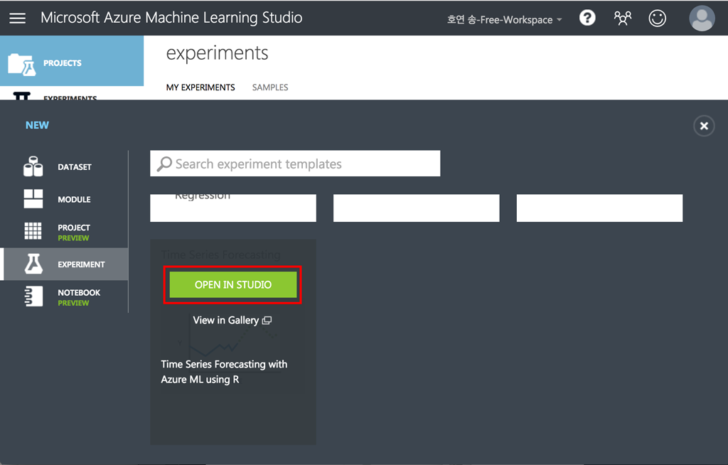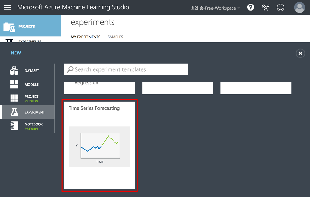EXPERIMENT 메뉴에서 맨 아래로 내려서 Time Series Forecasting 항목을 선택합니다.