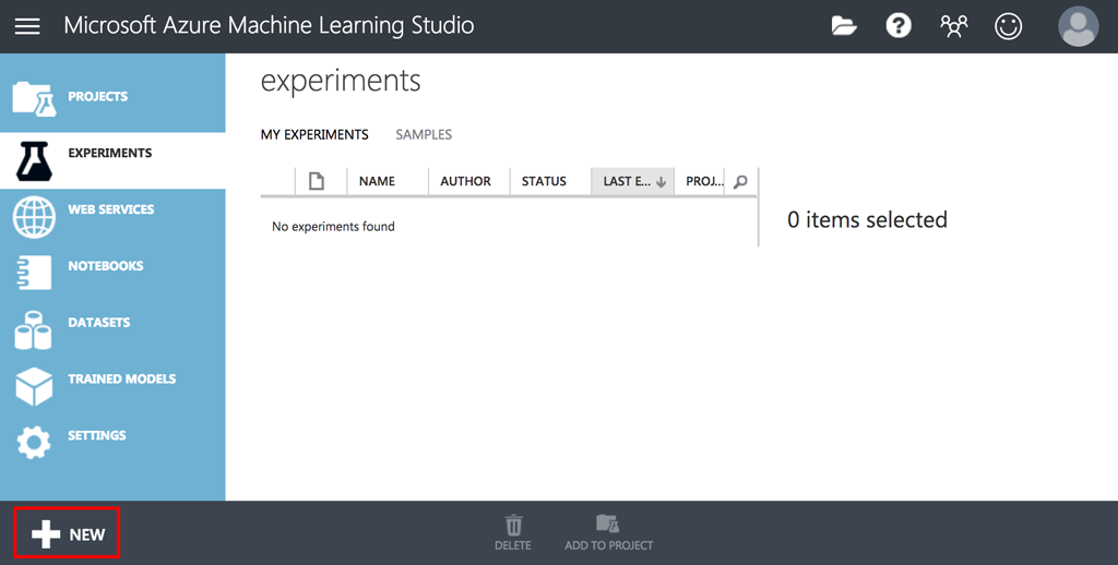 새로운 머신러닝 실험을 만들기 위해 왼쪽 하단의 [NEW] 버튼을 눌러보겠습니다.
