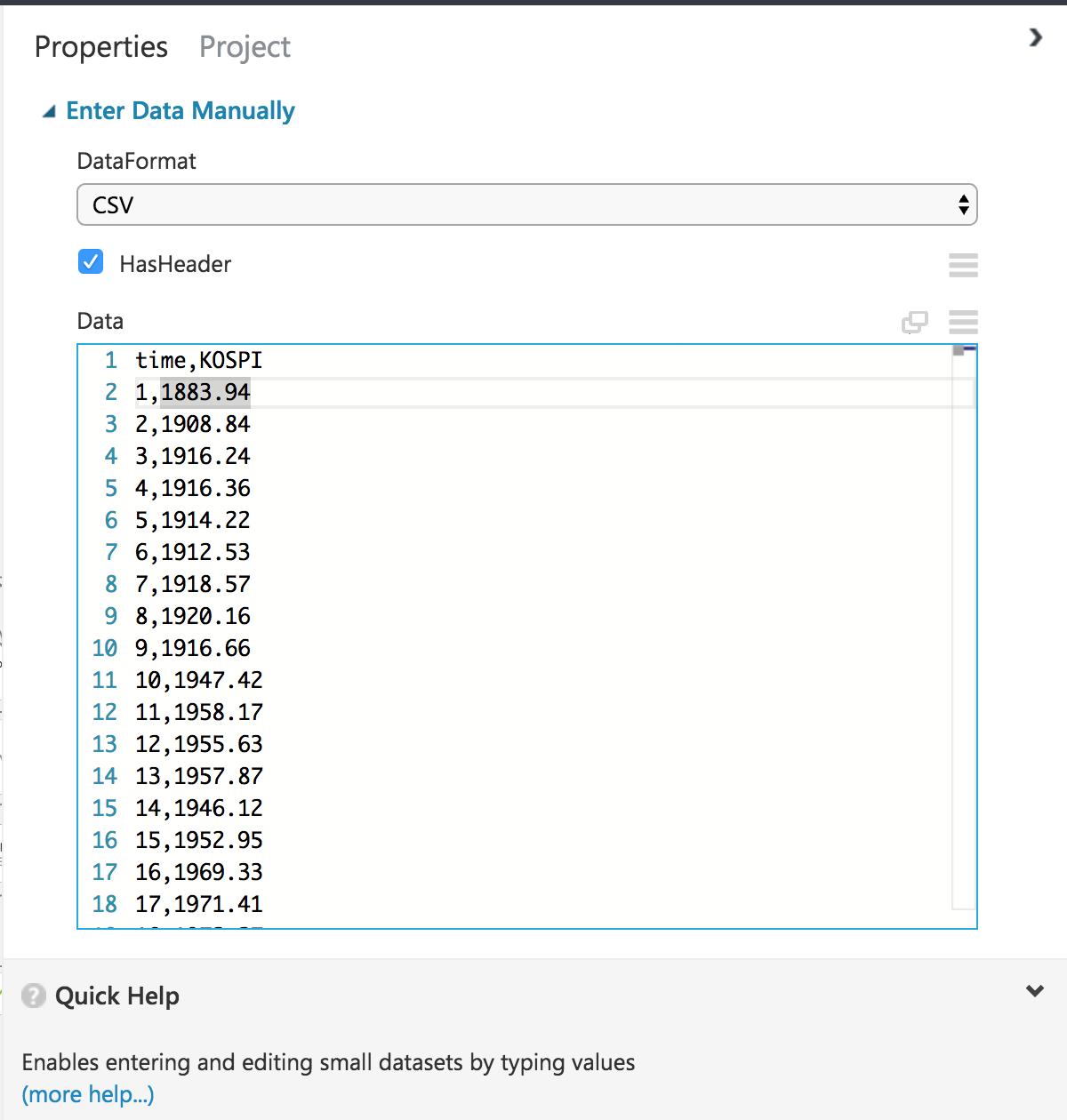 13. [Enter Data Manually]의 아래 동그라미와 [Edit Metadata] 위의 동그라미를 드래그하여 서로 연결해줍니다. 이 때 우리가 입력한 KOSPI 지수가 데이터로 입력됩니다.