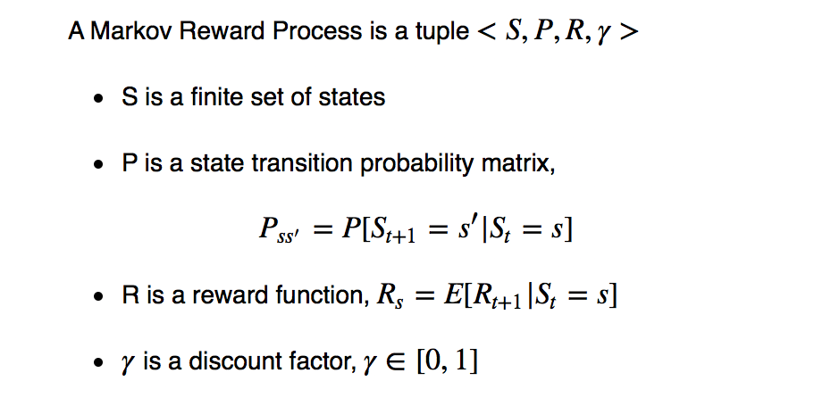 Markov Reward Process는 <S, P, R, gamma>로 이루어진 튜플입니다.