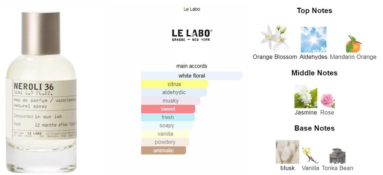 마지막으로 네롤리 36 (Neroli 36)입니다. 네롤리(Neroli)는 오렌지 나무의 꽃(Orange Blossom)을 일컫는 말입니다. 따라서 네롤리(Neroli)는 화이트 플로럴의 농염함과 시트러스의 상큼함을 동시에 보여주는 매력적인 향료입니다. 여기에 더해 재스민(Jasmine)과 장미(Rose)를 더해 꽃다발(부케)과 같은 풍성함을 더해주며, 시트러스함을 더하기 위해 만다린(Madarin)의 향을 사용하여 매력적인 향을 보여줍니다. 잔향으로는 사향(Musk)의 부드러움, 바닐라(Vanilla)의 달콤함, 통카빈(Tonka Bean)의 파우더리함을 더해 부드럽고 달콤한 느낌으로 마무리되는 매력적인 향수입니다.
