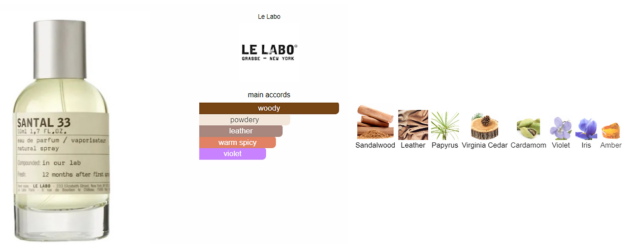 다음으로는 한국사람들에게 가장 유명하며, 인기 있는 상탈 33 (Santal 33)입니다. 2~3년 전 한국사람들에게 가장 인기 있는 향이자, 지금까지도 많은 사람들이 사랑하는 향이 바로 우디(Woody), 즉 나무향입니다. 그중에서도 백단(Sandalwood)가 가장 사랑을 많이 받았습니다. 이 상탈 33은 백단(Saldalwood)의 향이 가장 매인으로 사용된 향수입니다. 여기에 더해 가죽(Leather)의 거칠면서도 따뜻한 느낌, 아이리스(Iris), 바이올렛(Violet)의 파우더리 한 꽃향, 카다멈(Cardamom)의 스파이시함이 어우러져 따뜻한, 우디 향수의 매력을 극대화한 향수입니다.