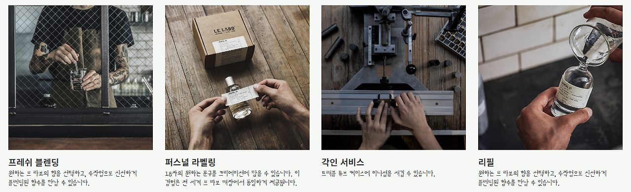 여기에 퍼스널 라벨링을 해주는데, 이 라벨링이 연구실에서 사용하는 병의 시료에 라벨링 하는 것과 느낌이 비슷해, 자칫 연구실을 연상케 합니다. 더불어 각인 서비스와 리필 등 다른 브랜드들과 차별화된 서비스를 보여주는 브랜드입니다.