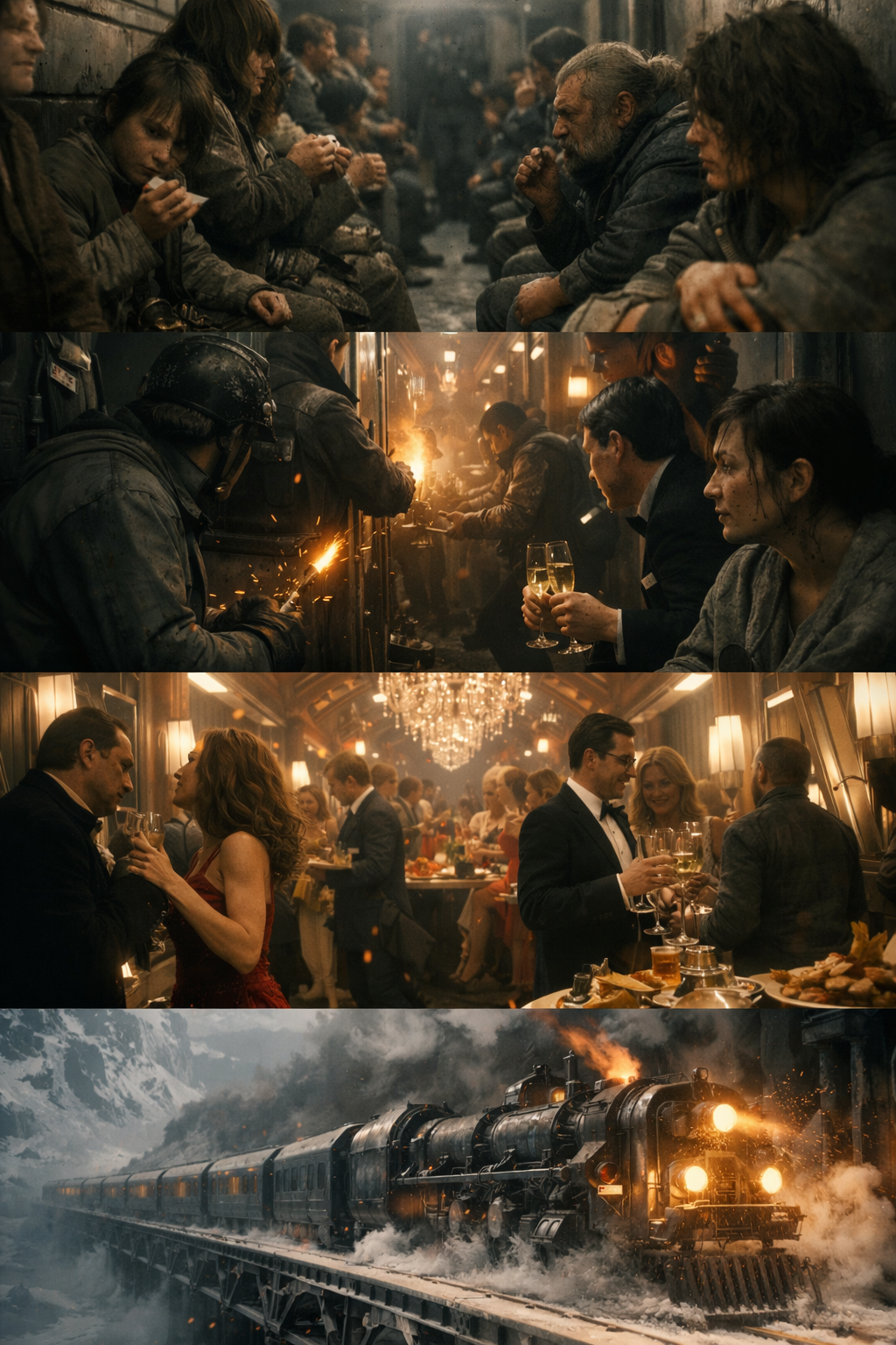 봉준호 감독의 영화 《설국열차》는 바로 이 임계점에 도달한 사회를 좁고 긴 기차 안에 압축해 놓았습니다. 기차 안의 세상은 결코 평등하지 않습니다. 꼬리 칸 사람들이 바퀴벌레로 만든 단백질 블록으로 겨우 생명을 연명하는 동안, 앞 칸의 사람들은 신선한 스테이크와 최고급 와인을 즐기며 영원할 것 같은 파티를 벌입니다. 이들을 가르는 것은 오직 '어느 칸에 올라탔는가'라는 우연한 위치뿐입니다.