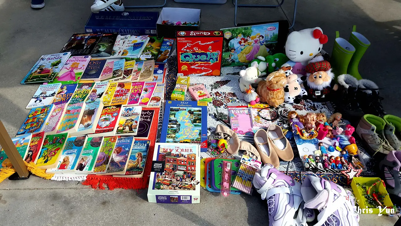 우리도 이전에 기부용으로 내놓거나 팔고 남았던 딸아이가 초등 때 읽던 소설책들과 그동안 버리지 못해서 끼고 있던 장난감, 직소 퍼즐, 보드게임 등을 챙겨서 장터로 나갔다.