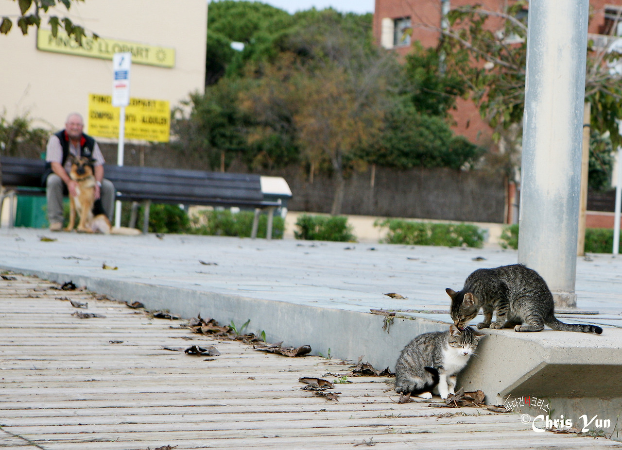 사진 속의 할아버지는 우리가 길냥이 먹이 주는 것을 자신의 반려견과 앉아서 기분 좋게 바라보다손을 흔들며 사라지고는 한다. 저 커다란 개도 길냥이들의 노는 모습을 바라만 볼뿐 결코 가까이 다가서려는 움직임을 보이지 않는다.