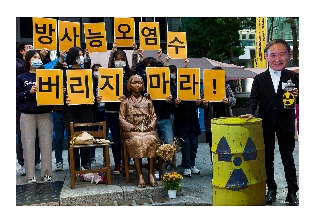 위 사진은 밝은 곳에서 주제를 더 돋보이게 하기 위해 플래시를 사용한 사진입니다. 흐린 날이었지만 촬영 시간이 오전 11시라 어둡지는 않았습니다. 플래시를 사용해서 피켓의 글자를 또렷이 보이도록 하였고 일본 총리를 묘사하는 가면, 방사능 마크가 그려진 드럼통과 물병의 컬러를 더 화사하게 만들었습니다. 디지털 보정으로도 가능하긴 하겠지만 이벤트 직후 바로 에디터에게 사진을 보내야 되는 상황이라면 플래시를 사용해서 원본을 잘 만드는 게 더 빠르기 때문에 플래시를 왕왕 사용합니다.