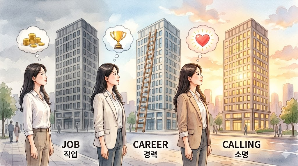 이 질문에 대한 답이 흐려질 때, 사람은 쉽게 버티기 모드로 들어갑니다. 의미가 사라진 자리에 남는 것은 계산뿐입니다. Wrzesniewski와 동료들(1997)은 사람들이 같은 일을 하더라도 그것을 직업(job), 경력(career), 소명(calling)으로 서로 다르게 인식한다고 설명했습니다. [14] 누군가에게 일은 생계 수단이고, 누군가에게는 성공의 사다리이며, 또 다른 누군가에게는 삶의 의미가 됩니다. [14]