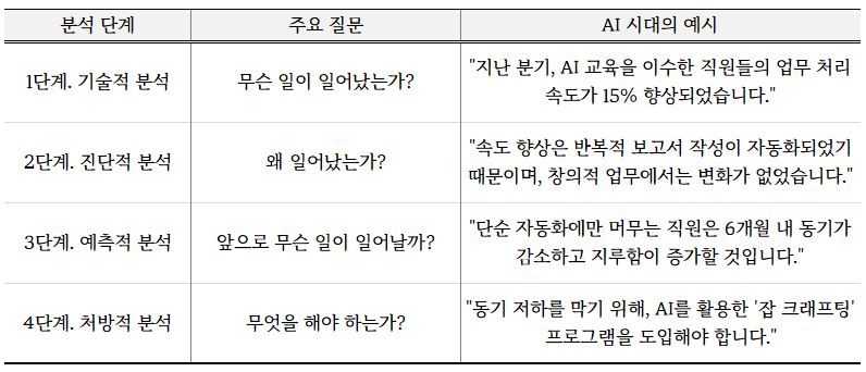 피플 애널리틱스는 분석의 깊이와 목적에 따라 크게 4가지 단계로 나눌 수 있습니다. [3] 이는 조직이 데이터를 활용하는 성숙도를 보여주는 지표이기도 합니다.