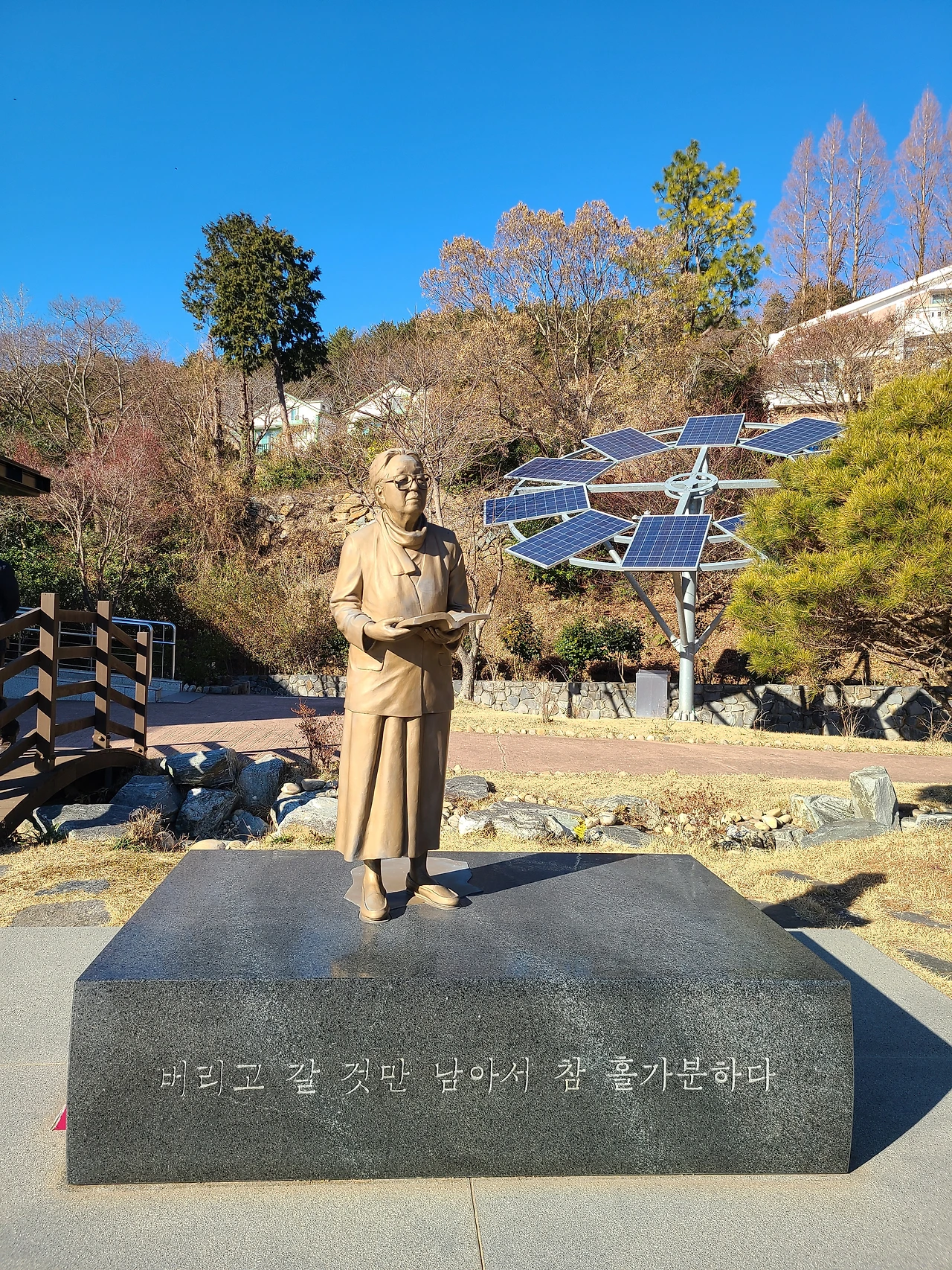 기념관 입구에 들어서면 푸근히 앉아 고추를 말리며 반겨주는 작가를 먼저 만날 수 있다. 2층 입구 앞뜰에는 안경을 쓰고 책을 든 자그마한 체구의 작가 동상과 "버리고 걸 것만 남아 홀가분하다"는 작가 말이 새겨져 있다