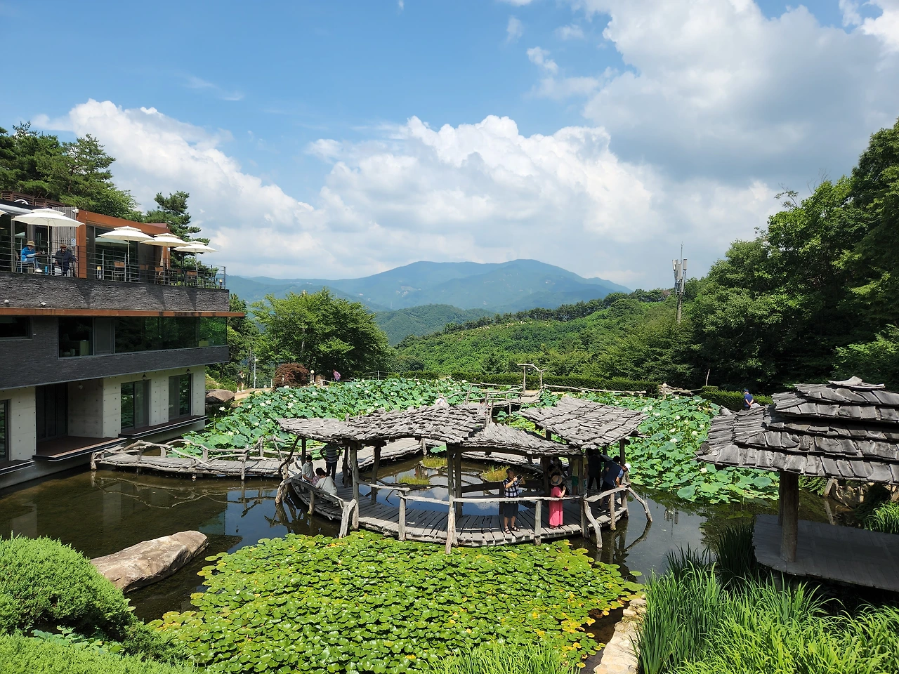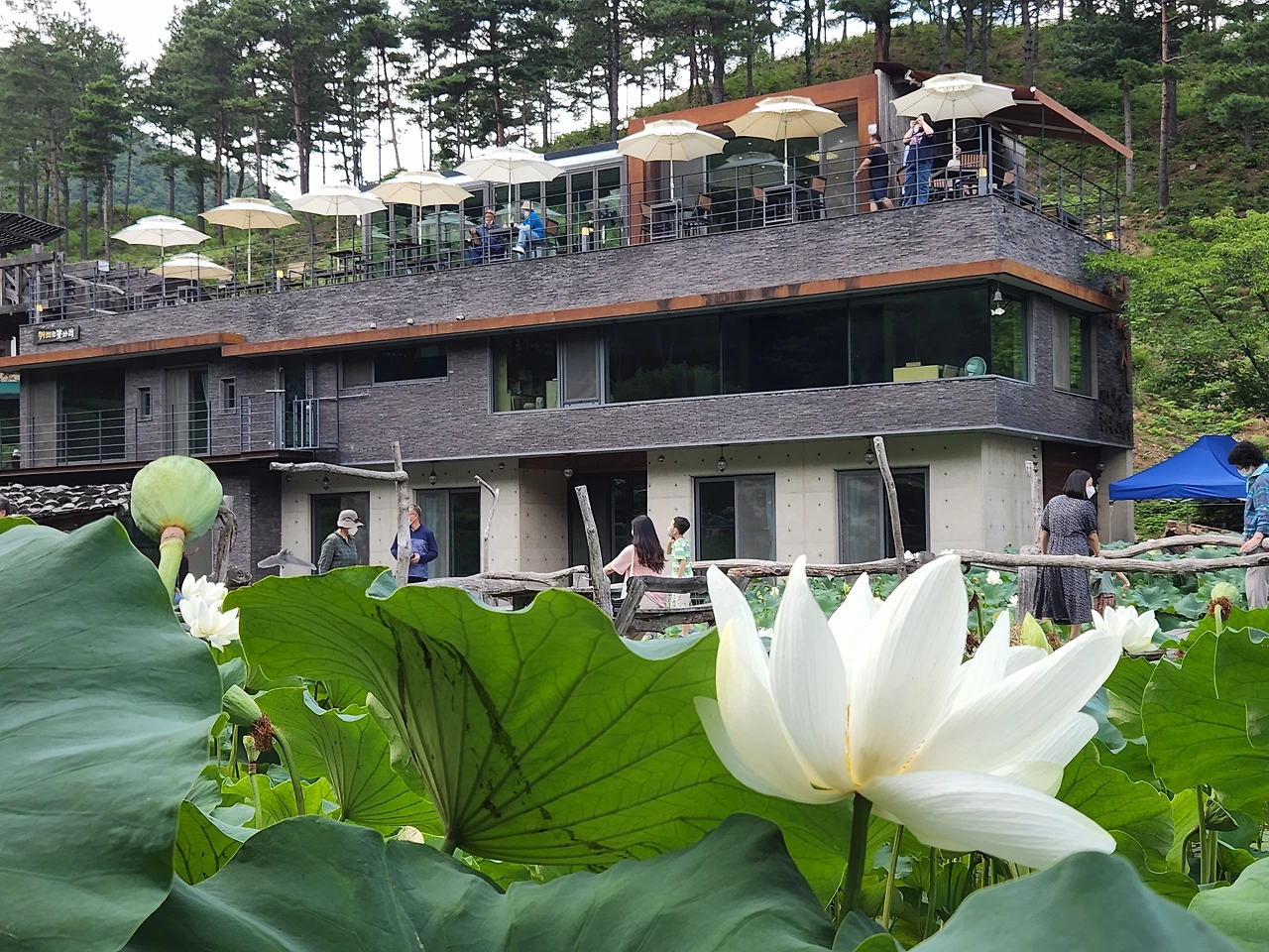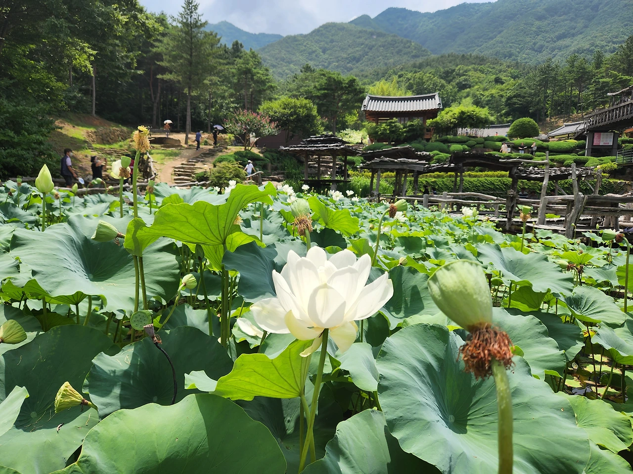 푸르고 푸른 너른 연잎과 하이얀 연꽃이 만발한 연못이 나온다. 그다지 크지 않은 연못이나 오래된 나무다리와 주변 나무데크, 그리고 너와지붕의 정자와 어우러진 연화소는 어느 사극의 배경마냥 신비스럽기까지 하다. 시대를 거슬러 사극의 한 장면으로 소환된다.