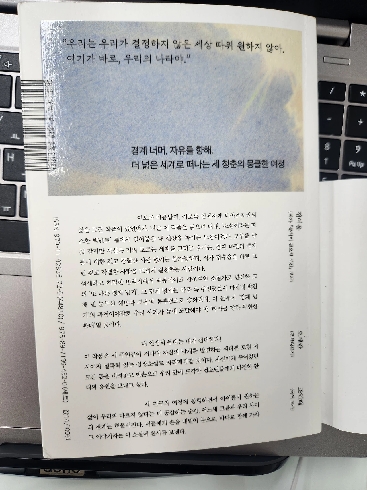 이 소설 속 세 명의 청소년은 본인이 원하는 삶을 살고자 하는 기본적인 선택권과 자유를 바랄 뿐이다. 그러기 위해 목숨을 담보로 국가를 벗어나려 하고, 타국에서 쫓기는 삶을 살아야 하고, 때로는 버림을 받아야 했다. 이는 남한의 청소년들은 상상하기 힘든 삶일 것이다. 그렇게 간절히 원하는 것은 이미 주어진 손바닥 안의 당연한 권리이라 여기기 때문이다. 또한, 고국을 떠나려는 자식들의 치기어린 행동일 지언정 응원하고 독려하는 남은 가족과 지인들의 사랑은 우리네와 똑같은 사랑, 그 자체였다. 그 따뜻함은 깊은 울림을 주기에 충분했다. 그러한 가족을 두고서라도 벗어나고자 하는 그 간절함은 더욱 애틋했다. 아름답고 섬세한 '디아스포라'라는 정여울 작가의 감상평에 공감되는 부분이다.