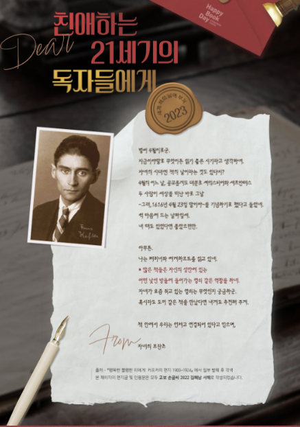 우선, 작년에 시인 '백석'에 이어 올해 아이콘으로 선정된 '카프카'의 인사말을 보자. 2022 교보손글씨인 김혜남 서체로 단아하게 써 있다.