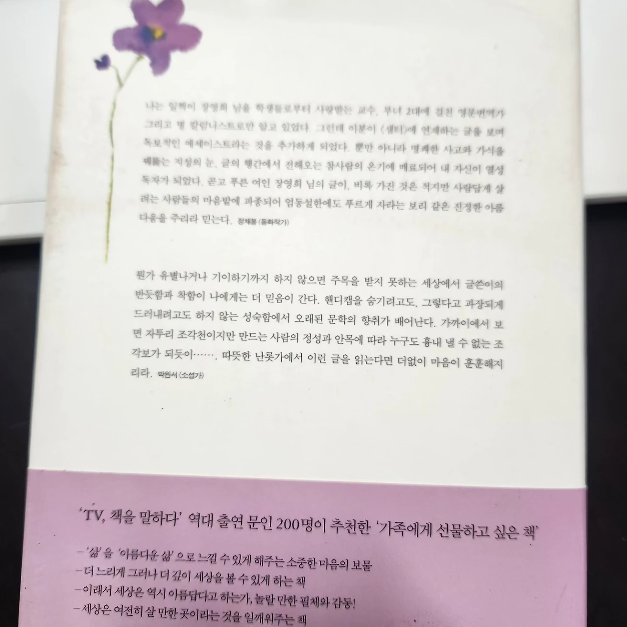 <글은 그 글을 쓴 사람이다>라고 느끼게 해주는 작가가 나에게는 장영희 교수님이다. 작가마다 나름의 문체적 특징을 지님은 당연한 것이며, 이는 그 작가의 오랜 삶의 습관이나 사고의 자연스런 반영이라 여겨진다. 글을 쓰다보면 알게 모르게 생활 습관적인 말투를 그대로 쓰고 있음을 느낄 때가 있다. 말과 다른 글이니 좀더 고상한 어휘나 꾸며서 쓰고자 해보면 곧 어색함을 느낀다. 결국 하던대로 하는 것이 편하다. 이런 점에서 장영희 작가는 한번도 만난 적은 없으나, 같이 옆에서 대화하는 듯한 느낌을 주는 작가이다. 이렇게나 솔직한 글이 있을까 싶을 만큼 유리처럼 본인을 그대로 드러나 보이는 글을 쓰셨다. 참 반듯한 글이며 그 사람이다. 진솔함과 소박한 글투에 그저 감동하게 하는 글이다. 부럽고 닮고 싶은 글이다.