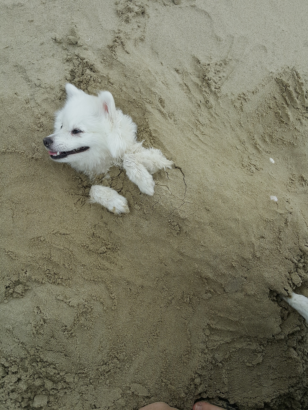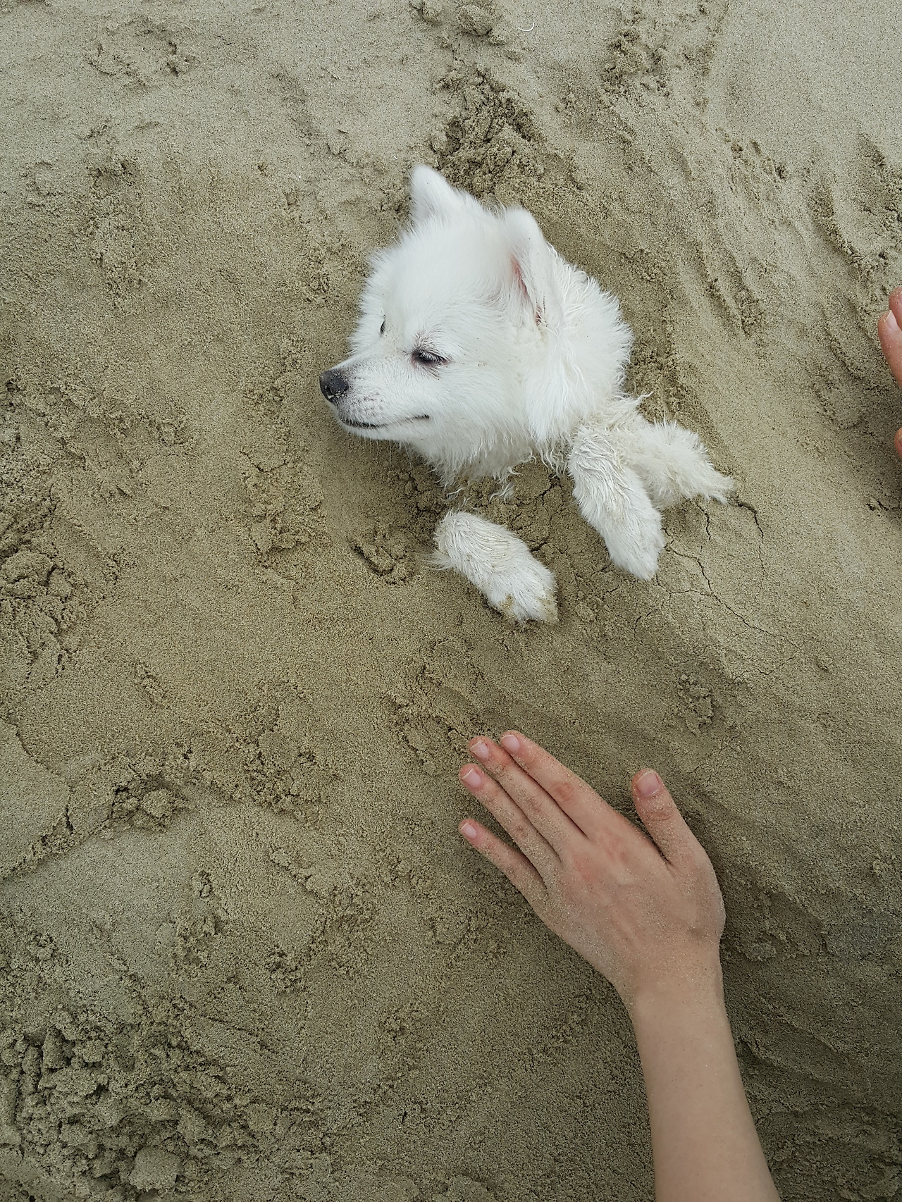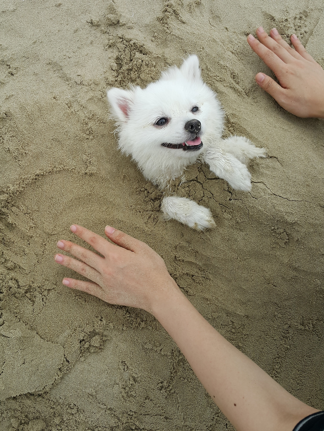 가족들이 교대를 하며 뭉치의 바다 적응 훈련을 하다보니 어느새 물에 동동 떠서 파도에 이리저리 흔들리면서도 바다 위에 고개를 들고 당당히 떠있는 뭉치의 모습을 볼 수 있었다.(구명조끼를 입어서 가만히만 있어도 가능한 것이었지만 힘을 빼고 고개를 든 모습이 그렇게 기특할 수가 없었다)
