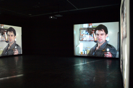 마틴 스콜세지 감독의 택시의 한 장면을 재생산한 Through A Looking Glass이 있다. 전시공간을 에워싼 네 개의 스크린에서 로버트 드니로가 위협적으로 총을 겨누며 편집증적으로 추궁하는 장면이 수 초의 인터벌을 두고 무한히 재생되고, 그 각각의 총구가 향하는 건 맞은편 스크린의 자기 자신이다. 작품 속 거울은 1차적으로는 현실 세계의 상을 그대로 모방하는 매체이며, 2차적으로는 거대한 다른 세계로 통하는 창이다. 32세의 드니로는 거울 속의 자신, 혹은 다른 차원의 자신과 싸움을 벌이듯 끝없이 질문한다.