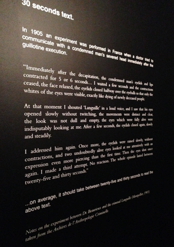 이 외에도 30초간 꺼졌다 켜지는 전구가 있는 새카만 방이 있었다. 참수당한 머리통과 죽음의 상관관계에 대한 연구결과를 읽는 데에 주어진 시간은 전구가 켜져 있는 30초뿐이다. 만약 텍스트를 다 읽지 못했고, 끝까지 읽기를 원한다면 새카만 방에서 또 다른 30초를 세어야 한다.