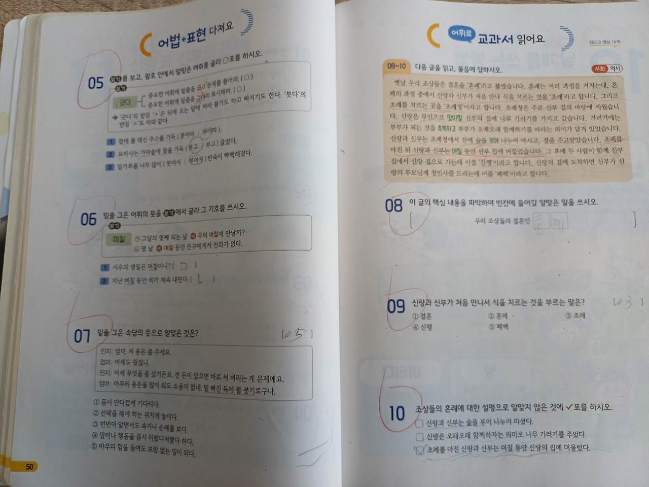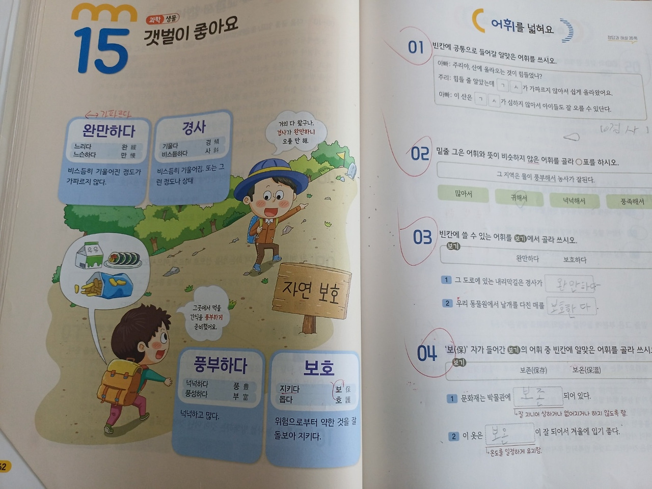 정답은.... 내가 욕심을 버리고 민우에게 맞춘 수업을 했기 때문이다. 민우가 한국어 수업을 싫어한 이유는 두 가지였다. 첫째는 쓰기를 싫어하는 것, 둘째는 쓰기를 싫어하는 이유가 되기도 한 자신감 문제. 그래서 나는 첫째로 쓰기 수업을 포기했다. 민우에게 가장 필요한 연습은 쓰기지만, 민우가 도망가고 책상에 드러눕고 할 정도로 수업을 거부하는데 어찌하겠는가. 쓰기를 과감히 포기하고 단어 공부를 시키기로 했다. 둘째, 일부러 민우 수준보다 쉬운 단계의 문제집을 썼다. 민우에게는 주미와 하준이처럼 교과 어휘를 학습할 수 있는 문제집인 <완자 공부력 어휘> 문제집을 활용했는데, 민우의 교재는 <완자 공부력 어휘 2B>였다. 민우는 3학년인데, 이 문제집은 1학년 2학기- 2학년 수준이다. 이렇게 쉬운 단계의 단어를 공부하게 하며 민우의 자신감을 높이는 것이 내 수업 전략이었다. 주미나 하준이에게는 문제집을 가지고 다니게 했는데, 민우에게는 이 문제집이 사실 본인 수준보다 쉬운 수준이라는 것을 숨기기 위해 민우에게 주지 않고 내가 가지고 다녔고, 이것은 대 성공이었다.