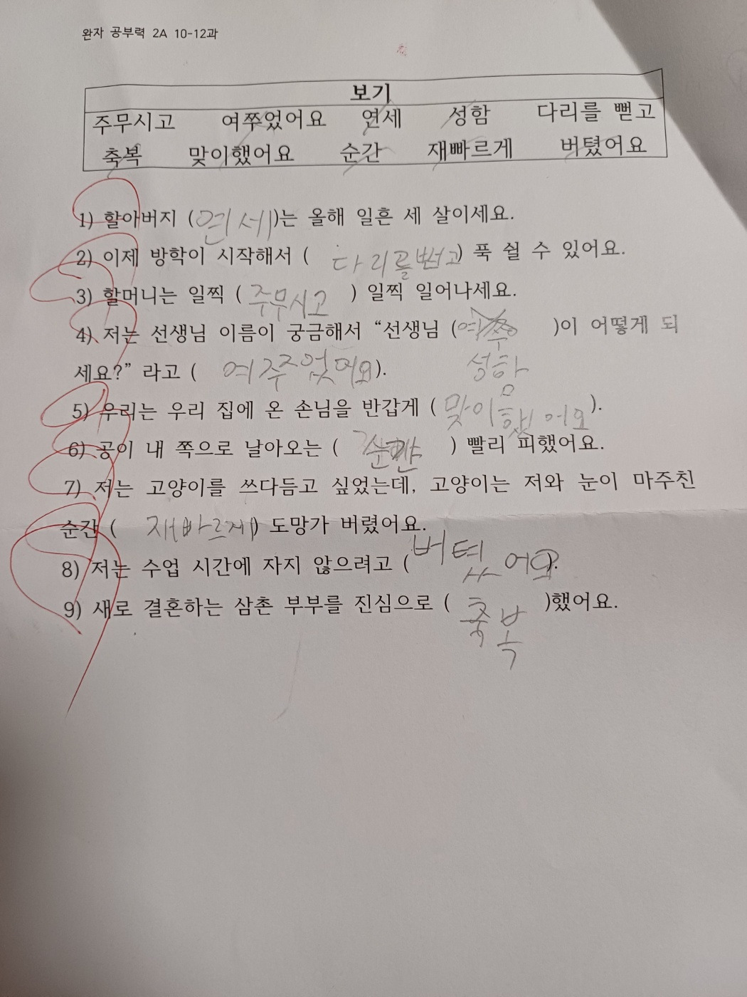 민우는 처음에는 너무 쉬워서 지루하다고 빨리빨리 하고 집에 가고만 싶어 했다. 내가 오늘 어디까지 한다고 말을 하면 거기까지 달리기를 하듯 문제를 다 풀어 버리고 '시간이 몇 시냐, 우리 언제 가냐' 타령만 했다. 문제집의 1-3 챕터가 끝나면 배운 단어를 빈칸에 채워 넣는 문제를 10-15 문제 정도 냈는데, 그것도 후루룩 다 해 버렸다. 그 과정에서 본인이 그렇게 싫어하는 단어 '쓰기' 활동을 한다는 것은 인지를 못 하는 듯했다. 계속 동그라미가 죽죽 쳐지니 민우의 자존감도 죽죽 올라갔다.