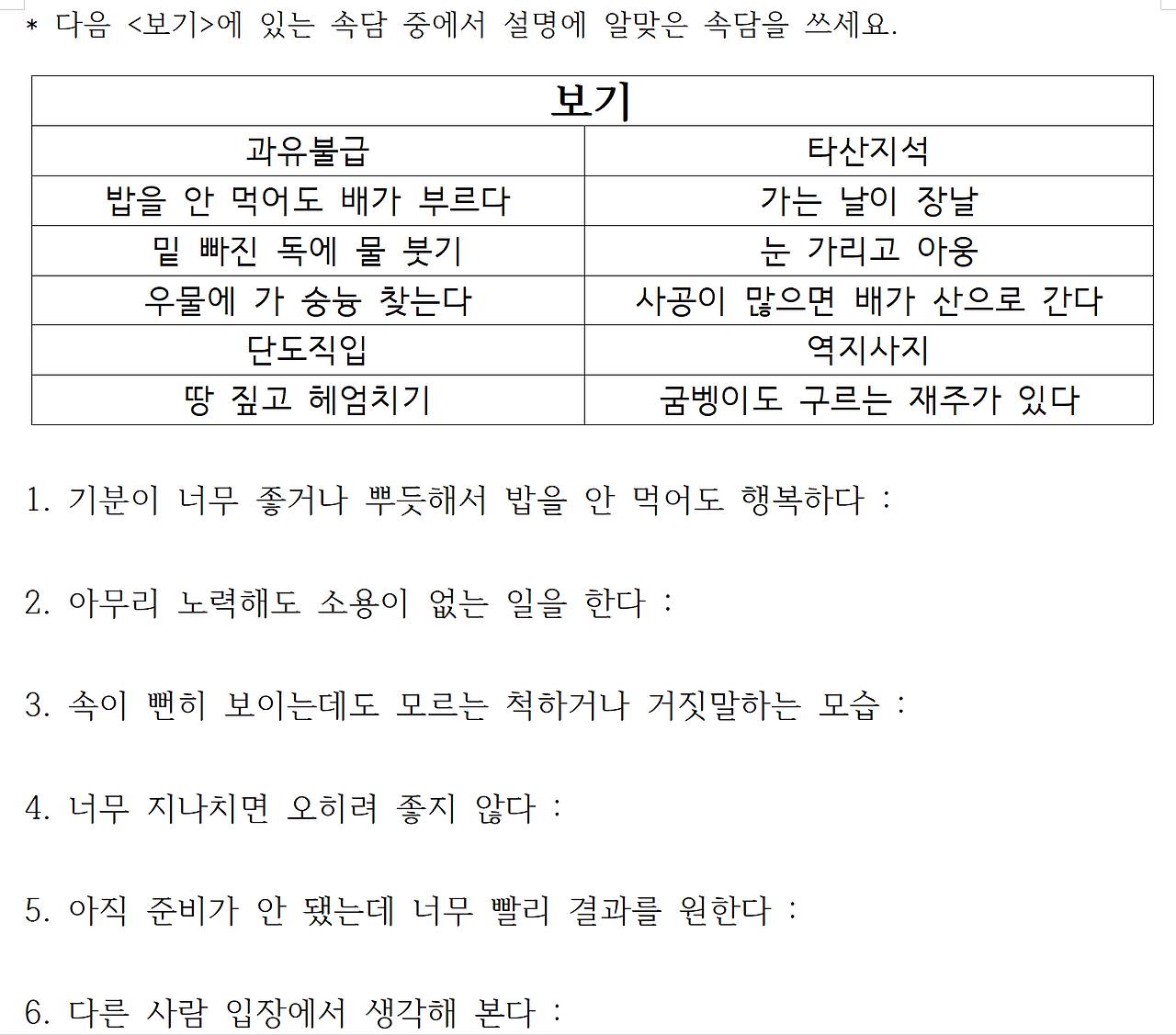세상에 우리 민우가 '공부를 해 오다'니! 처음 듣는 말이었다. 당장 교재를 치우고 속담 문제부터 했다. 뜻을 읽고 해당하는 속담을 쓰는 문제였다. 그렇게 그렇게 쓰기를 싫어하던 민우는 아주 열심히 집중해서 속담을 써 내려갔다. 나중에는 사자성어에도 관심이 생겨 그 어려운 사자성어도 좋아하기 시작했다. 이런 수업이 좋았는지 나중에 민우 담임선생님께 듣기로는 한국어 수업 시간에 속담을 공부했다고 자기가 아는 속담을 막 자랑했다고 한다.
