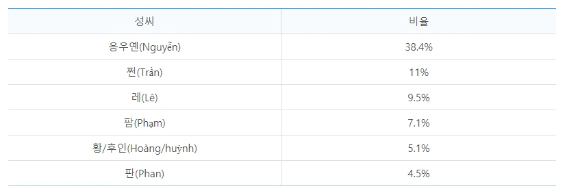 베트남에는 700여 개 정도의 많은 성씨가 있지만 ‘응우옌’, ‘쩐’, ‘레’, ‘팜’, ‘황/후인’, ‘판’ 등이 가장 널리 쓰입니다. 가장 많은 성씨인 ‘응우옌’, ‘쩐’, ‘레’는 유명한 왕조의 성씨에서 비롯되었습니다.