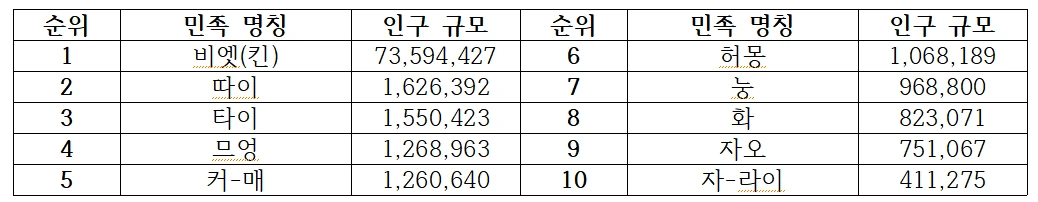 베트남 민족 집단의 인구 규모(출처: <베트남의 소수민족>, 당 응이엠 반 · 쭈 타이 선· 르우 홍, 조승연 옮김(2013), 민속원)