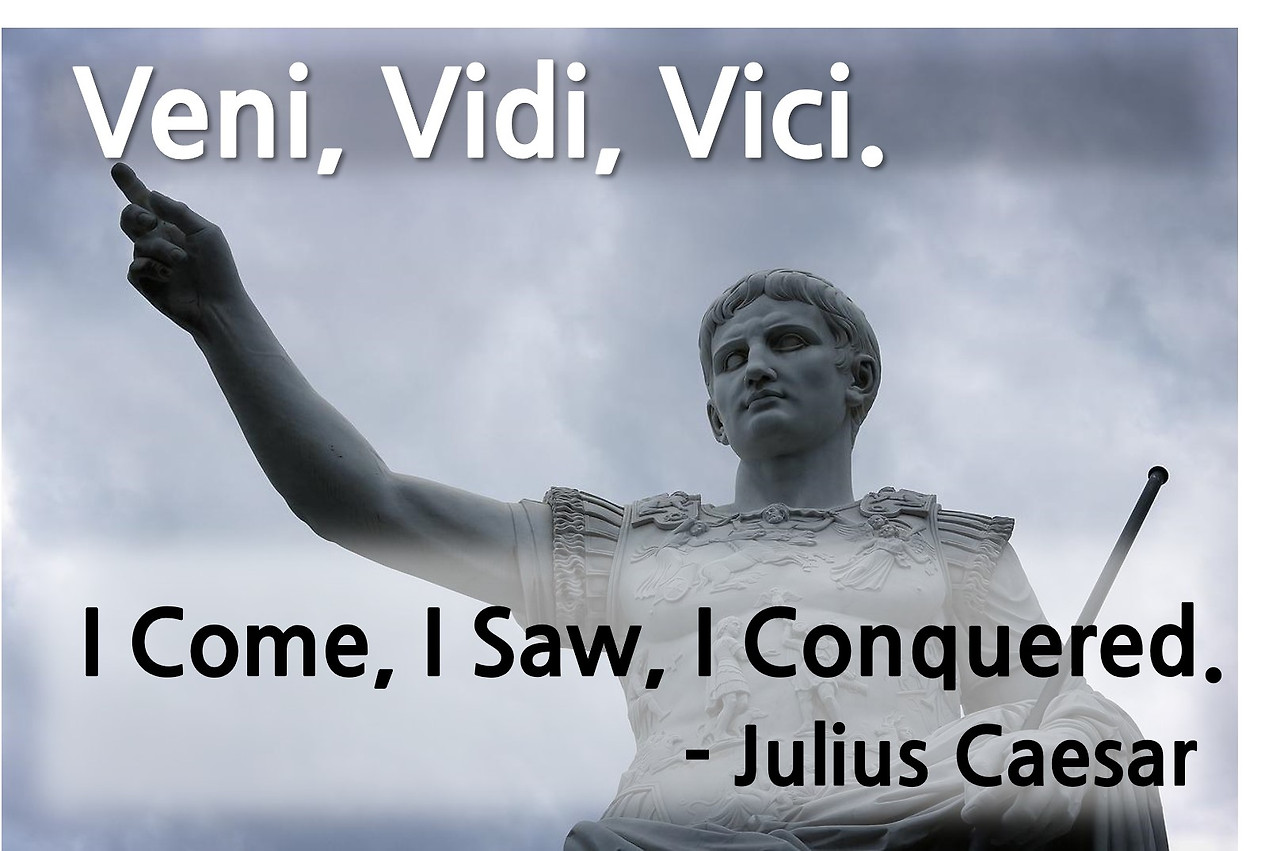 가이우스 율리우스 카이사르(Gaius Julius Caesar, BC 100~44)는 고대 로마 시대의 장군이자 정치가로 이름을 떨쳤다. 서양사에서 '브루투스 너마저(Et tu Brute)‘라는 외침을 남기며 절친한 친구 브루투스에게 죽임을 당한 로마 황제로 기억한다. 그는 기원전 47년에 로마 공화정 내부를 평정하는 전쟁들을 차례로 승리로 이끌며 로마제국의 기틀을 세웠다. 당시 'Veni, Vidi, Vici'라는 글귀를 로마 원로원에 전쟁 승전보로 날렸다. '왔노라, 보았노라, 이겼노라'라며 보란 듯이 승리를 자랑했다.