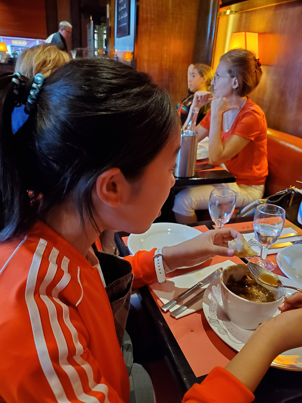 제가 힘을 다시 찾은 건 저녁 식사 시간입니다. 하루 종일 에펠탑 꼭대기, 개선문, 샹젤리제 구석구석 돌아다녔지만 그 날의 클라이맥스는 사실 동네 레스토랑이 될 줄이야! 갑자기 17년 전에 프랑스 현지인 친구가 사 줬던 홍합탕이 먹고 싶어, 그냥 "Paris Mussels"라고 검색해서 찾아간 동네 레스토랑 Le Suffren. 그러나 이게 개인적으로는 오늘 하루 최고의 코스였습니다. 전채로 시킨 French Onion Soup (양파와 치즈가 가득한 수프), Melon with Parma Ham (멜론에 햄을 쌈 싸 먹는), 그리고 Mushroom Targeliatelle (파스타 같은 면)와 Moules et Frites (홍합탕) 모두 그릇까지 흡입하고 싶을 정도로 맛있었어요.
