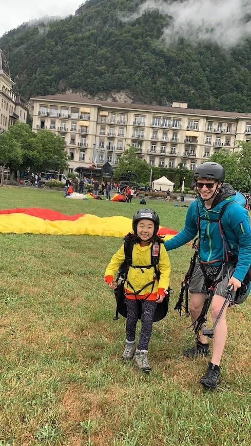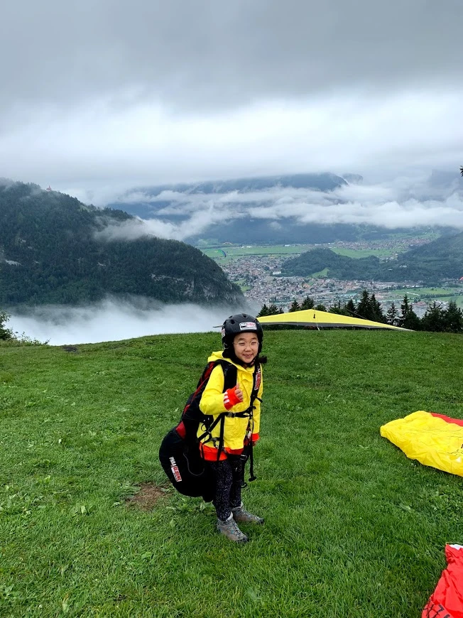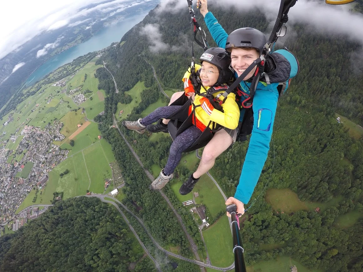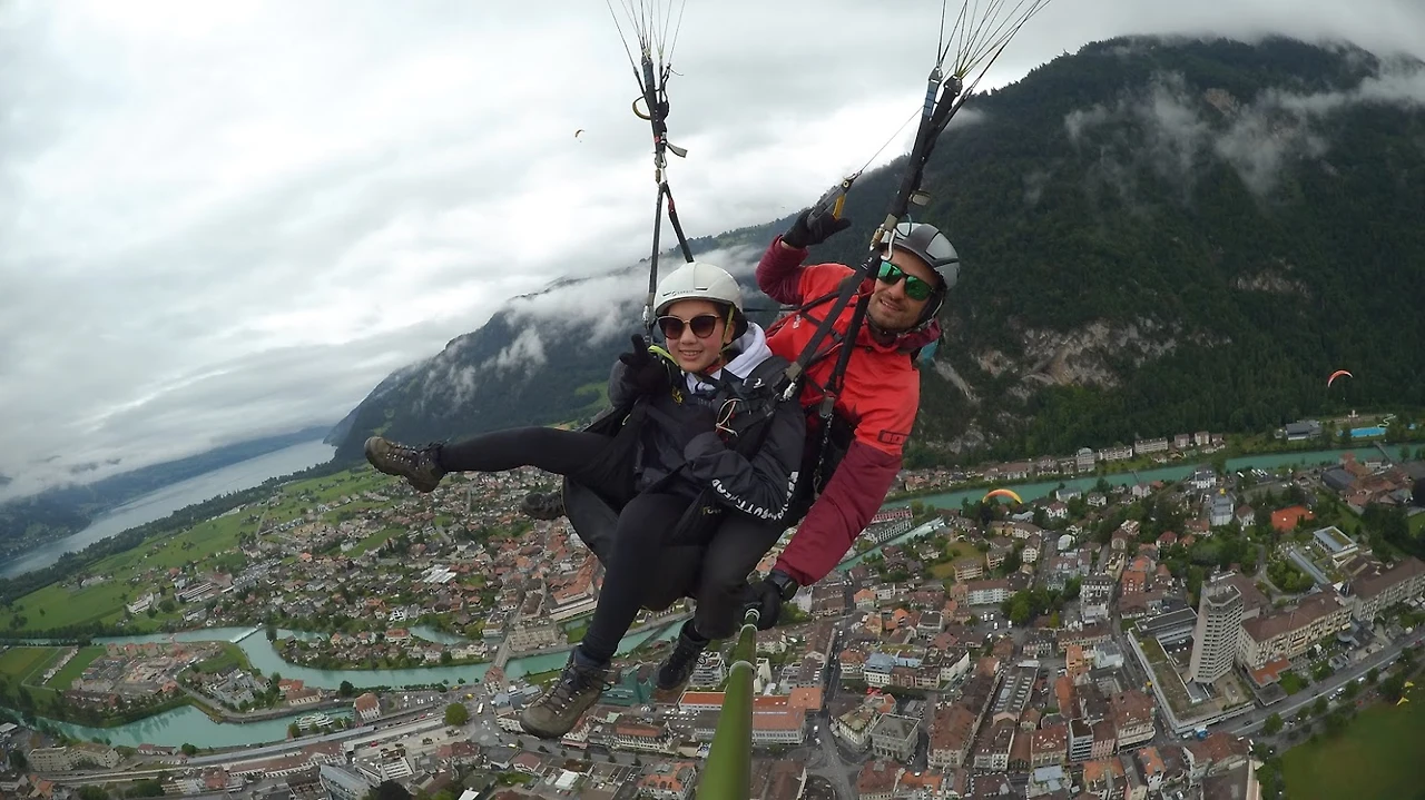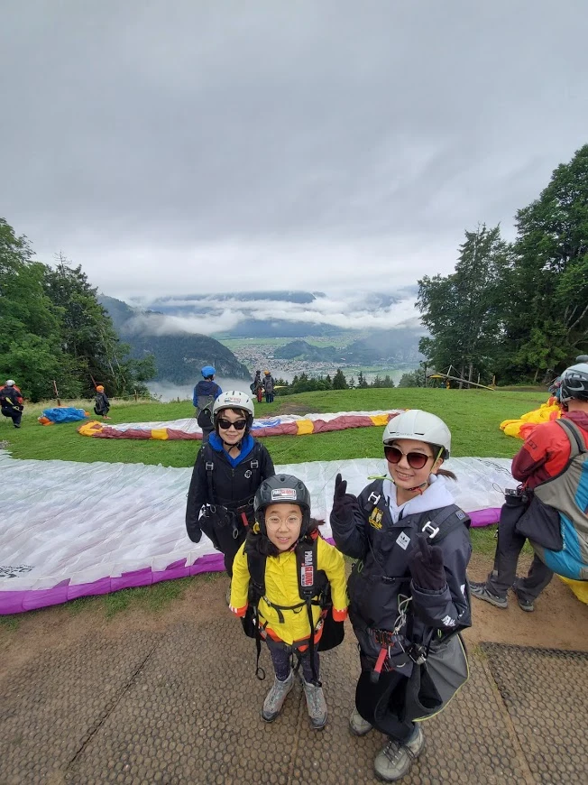그중에 한 팀을 시선으로 끝까지 좇다 보니, 안개가 희미하게 걷혀 있는 게 눈에 들어온다. 신기했다. 다시 시선을 넓혀보니 안개가 꽤 걷혀 저 멀리 우리가 착륙할 인터라켄 마을이 보였다. 감탄과 안도가 복잡하게 섞인 한숨이 새어 나왔다.