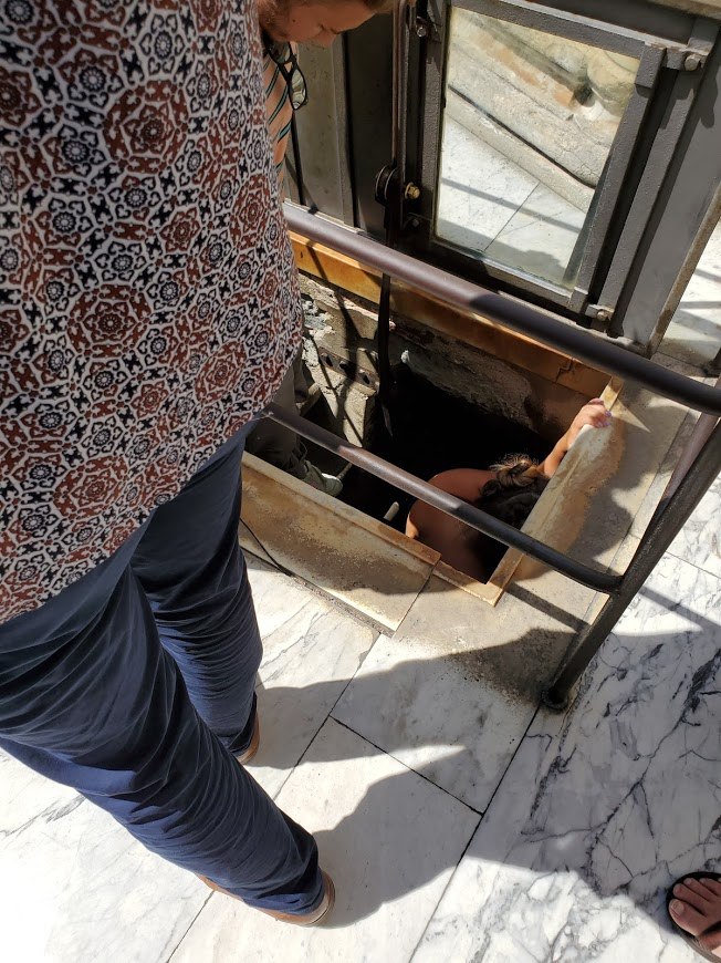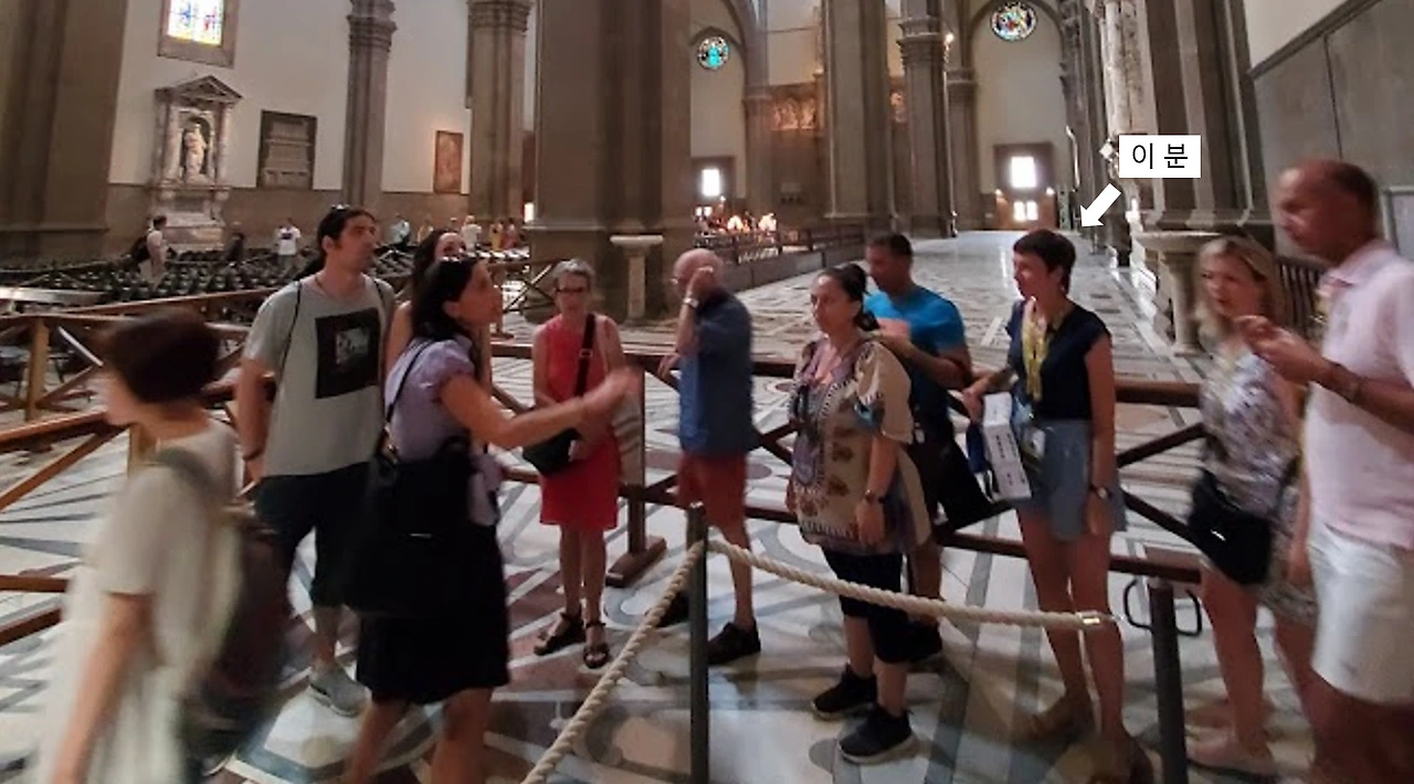 만남의 장소에서 이름을 확인하고 헤드셋을 받아 사용법을 간단히 익힌 뒤, 약 5분 정도 밖에서 설명을 들었다. 돔으로 바로 올라가는 입구에서 안으로 들어가면 사실 대성당 내부를 볼 수 있기 때문에 (그것도 두 번: 아래에서 한 번, 위에서 한 번) 독실한 천주교 신자로서 대성당에 들어가는 것에 큰 의미가 있지 않는 한 꼭 대성당의 기나긴 줄을 따라갈 필요가 없다고 한다. 위 사진에서도 뒤로 대성당 내부가 보인다.