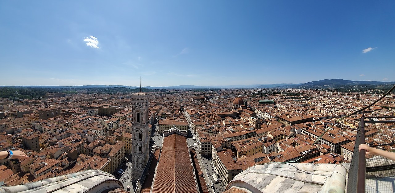 꼭대기에서 바라본 피렌체 전경. 붉은 벽돌로 뒤덮인 풍경이 에펠탑에서 보는 풍경과는 다른 맛이었다. 바로 코 앞에는 종탑, 저 멀리는 우리가 도착했던 Firenze S.M.N. 기차역이 보인다. 종탑도 걸어 올라갈 수 있다. 올라가 봤자 풍경은 대동소이하다는 말에 포기했지만, 나중에 생각해보니 두오모 돔을 코앞에서 볼 수 있다는 큰 차이가 있었다. 하지만 미리 알아챘어봤자 결과는 같았을 것이다. 이미 찌는 듯한 더위에 모두가 지쳐버렸다. (약 35도까지 올랐다)