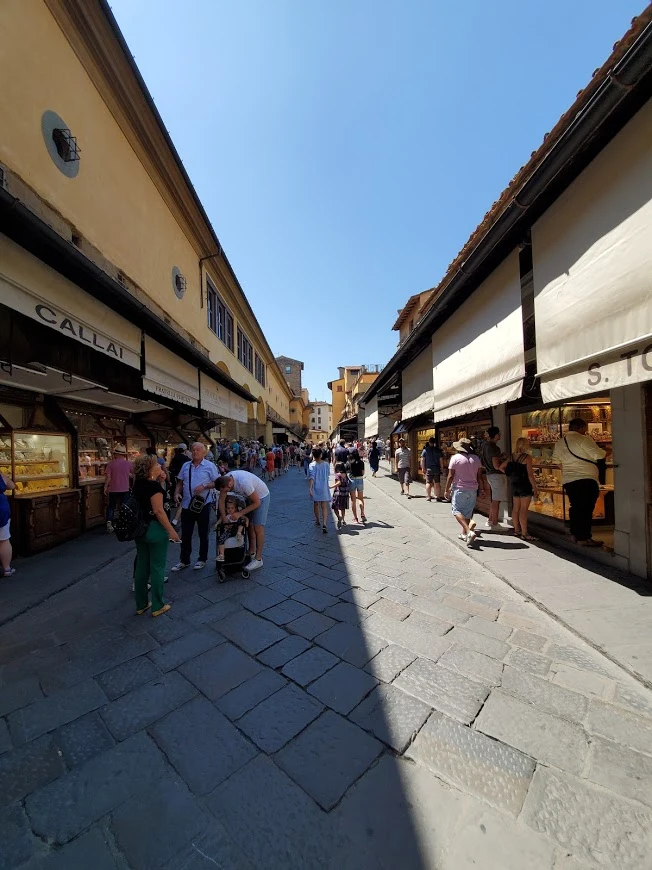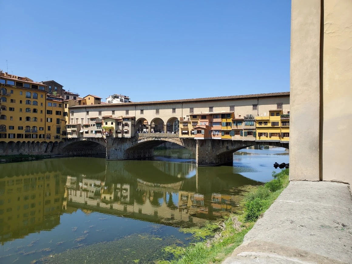 베키오 다리. 알록달록한 상점들 위로 일렬로 난 창문은 메디치 가문이 우피치에서 강 건너 새 별장으로 가는 비밀(?) 통로라고 한다. 이 비밀 통로를 만들고 나서 베키오 다리를 채웠던 생선이나 살라미 가게들을 싹 다 정리하고 보석 가게들로 채워놨다고 한다. 냄새 때문에.