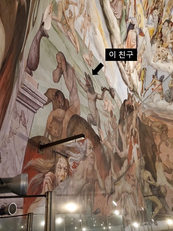 두오모 돔 천장을 수놓은 "최후의 심판"에 등장한 7가지 원죄 중 가장 귀여웠던(?) 개구리. 개구리는 탐욕을 상징한다. 사진에는 잘 안 나오지만 7가지 원죄를 상징하는 동물 중 말과 멧돼지의 순서를 잘못 그려 나중에 수정하기도 했다고 한다. 자세히 보면 말이 멧돼지처럼 목이 짧고 멧돼지는 말처럼 다리가 길다. 잘못 그린 걸 알았을 때 얼마나 살 떨렸을까 생각해보면 마냥 웃을 수만은 없다. 나탈리아는 이 천장 그림을 설명하는 데에 약 30분을 썼는데, 나중에 물어보니 아이들에게는 가장 신나는 시간이었다고 한다.