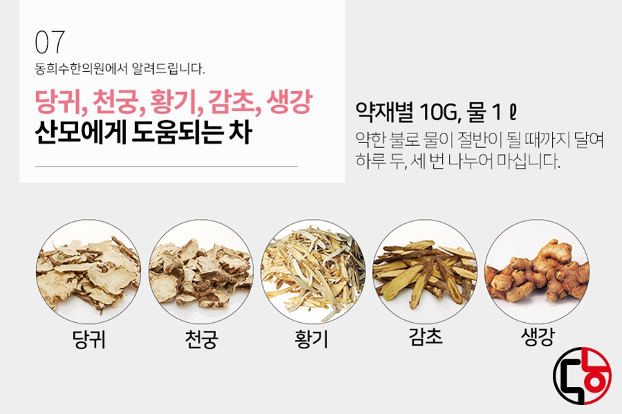 집에서 쉽게 산후조리에 도움되는 차를 달일 수 있답니다. 당귀와 천궁, 황기, 감초, 생강을 이용하여 달여주시고, 하루에 서 너번 나누어 복용해주시면 도움이 됩니다.