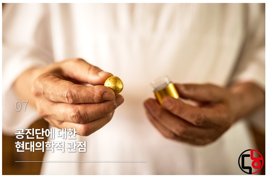 "허약한 체질을 개선해주며, 체력을 길러주고 간 기능을 이롭게한다. 전신 기혈순환을 원활하게 해주는 최고의 명약이다." 그리고 "나이가 들면서 기력이 떨어지며 몸이 약해지는 것은 태어날 때부터 가진 선천적인 문제가 아니다. 이럴 때는 성질이 자극적인 약재를 사용하면 좋지 않다. 오직 보(補)해주는 약을 사용해야하는데, 대부분의 보약은 효력이 떨어져 효과를 보기 어렵다. 오직 공진단만이 가장 적합하다." 라고 기재되어 있습니다.