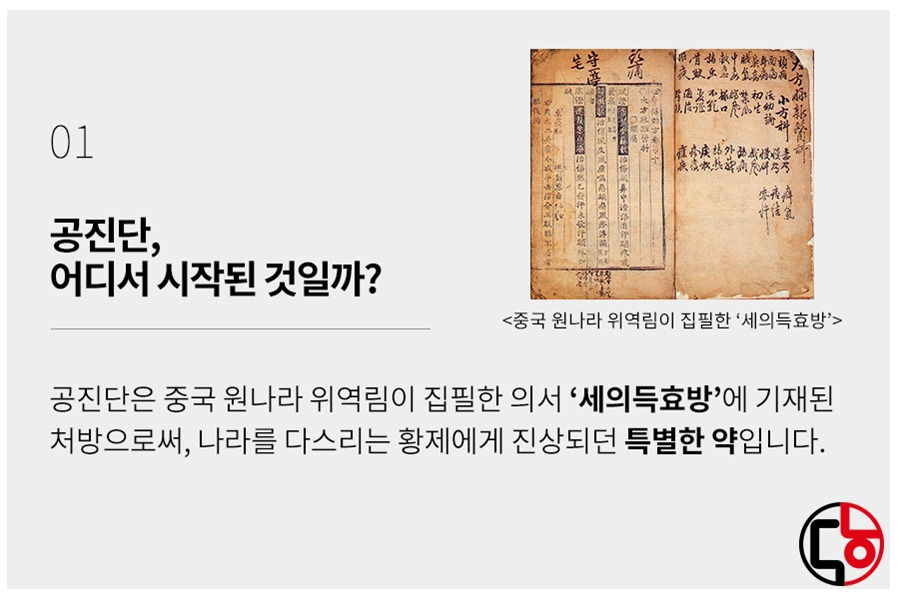 공진단은 중국 원나라의 명의(名醫) 위역림의 저서 '세의득효방(世醫得效方)'에 기록되어 있는 처방입니다. 나라를 다스리는 황제를 위해 진상되던 특별한 약, 공진단에 대해 세의득효방에는 다음과 같이 적혀있습니다.