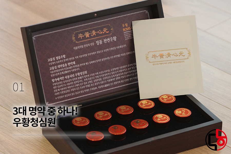 우황은 소의 담관, 담낭에서 염증이 발생하여 생기는 '결석'을 건조한 것으로써, 경련을 예방하며 혈압을 지속적으로 강하, 해열작용, 담즙 분비 촉진 등의 효능을 가지고 있습니다. 그렇기에 고혈압 및 뇌일혈, 간염 등에 이용될 수 있습니다. 한의학적으로는 맛이 단맛도 있고, 쓴 맛도 가지고 있습니다. 또한 서늘한 기운을 가진 약재로 심장의 열을 내려주고 담을 해소하고 해열작용 및 진경 작용을 할 수 있습니다.