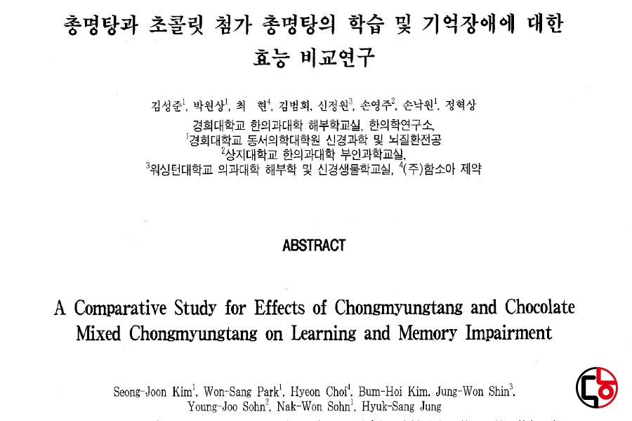 위 논문에 따르면, 수중 미로 장치에서 학습 및 기억력 측정, 공간 기억력 유지 검사 등을 통해 차이점을 알아보았습니다. 바로 그 결과는 초콜릿 총명탕도 총명탕과 유사하게 효과를 내었다고 합니다. 한약이 써서 먹지 못하는 이들에게 도움이 될 수 있는 소식이기도 합니다.