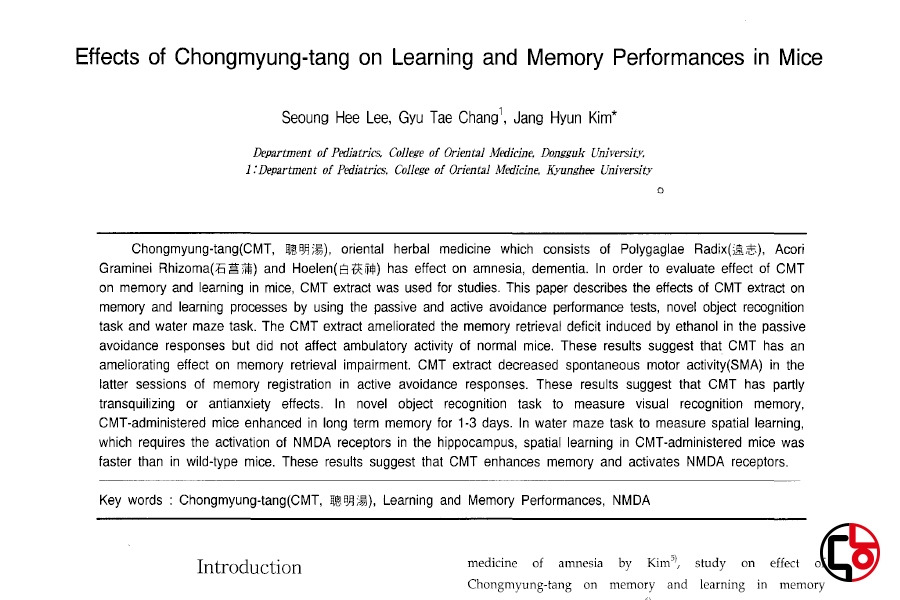 위 논문은 쥐 학습능력 및 기억능력에 대한 총명탕 효과 연구로서, 총명탕 추출물이 기억력과 학습능력에 미치는 영향과 건망증, 치매에 대해 임상적 활용 근거를 마련하는 연구였습니다.