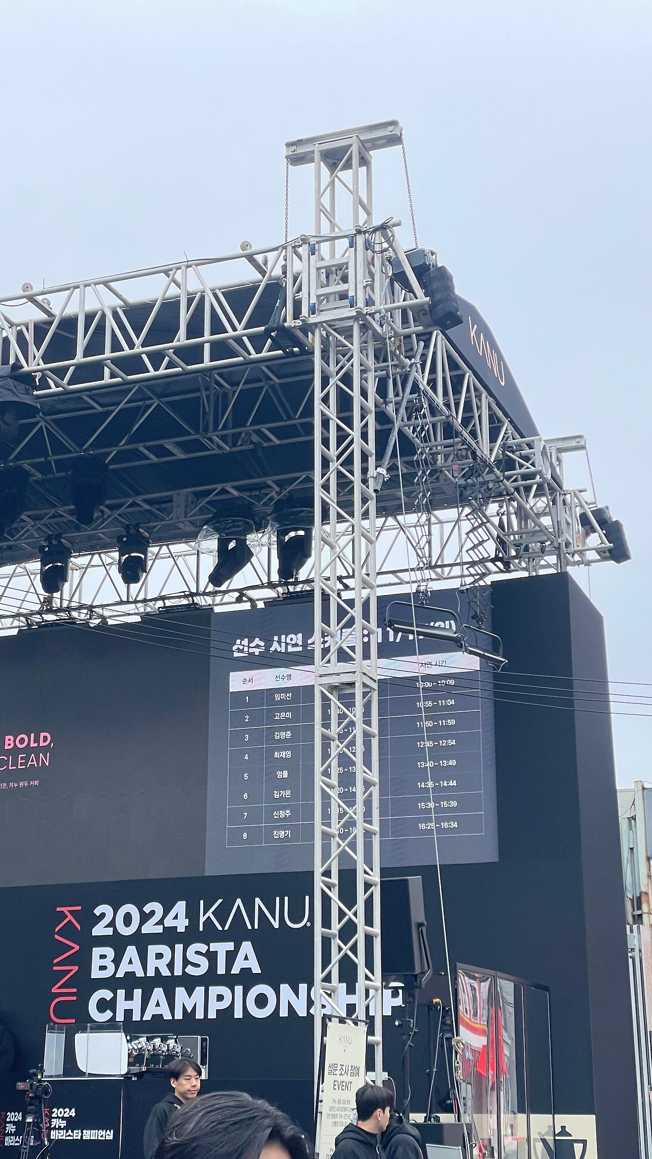 대회는 10시부터 임미선 바리스타님의 시연을 시작으로 고은미, 김명준, 최재영, 엄폴, 김가은, 신정주, 진명기 바리스타 님까지 각자의 시그니쳐 커피를 만들어내셨어요. 특히, 그날 날씨가 갑자기 추워졌는데 무대가 야외라서 선수분들이 정말 고생많으셨을 것 같아요. 추위에 맞춰 온도 등 다시 세팅을 바꾸셨다는 얘기도 들었습니다. 관람객을 위해 카누측에서 담요와 핫팩을 엄청 제공했지만 저는 추위에 못 버티고, 두 분의 시연만 보고 왔습니다.
