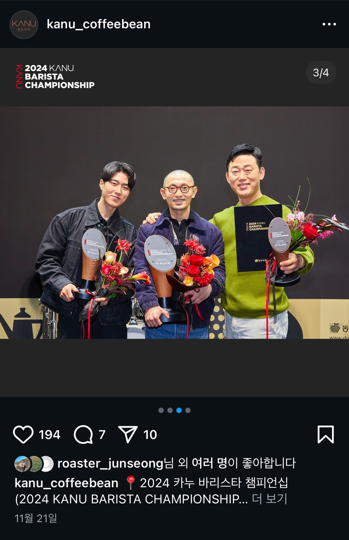 나머지는 유투브로 보면서 초대 챔피온의 탄생도 지켜봤습니다. 카누 바리스타 초대 챔피온이 되신 최재영 바리스타님께 다시 한번 축하의 박수를 보냅니다. 4위를 하신 임미선님도 축하드리고, 다른 분들도 정말 수고많으셨습니다.