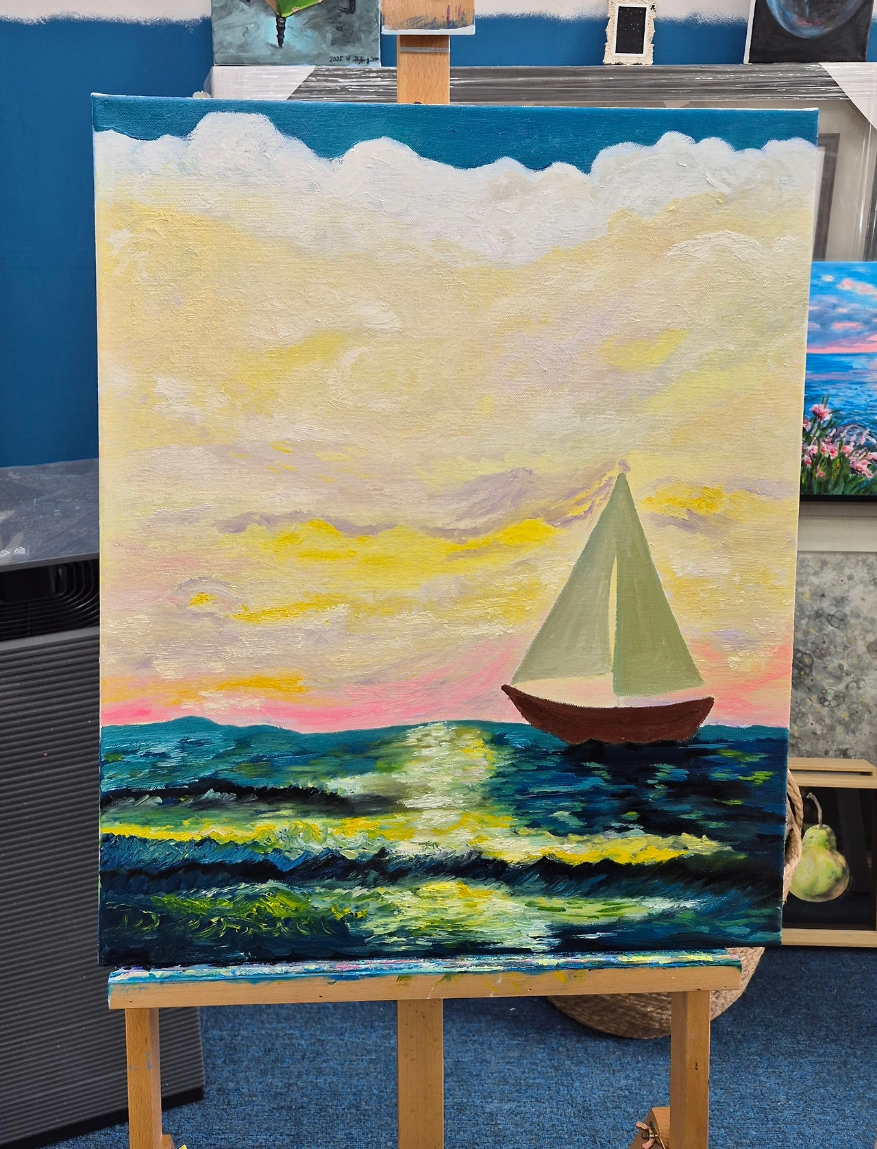 저녁노을 지는 바다앞 조각배