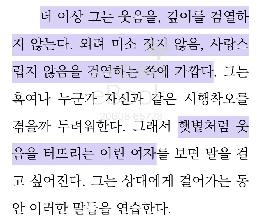 처음에 읽고 정말 머리를 한 대 맞은 것처럼 형광펜조차 못 그었던 부분 언제부터였는지 몰라도 나 역시 정확히 같은 생각을 하고 있었고 그래서 사회에 처음 나갈 때도 조심하려 했다. 시간이 지나면서 느끼는 건, 그렇게 오해할 사람은 오해하게 되어 있고 아닌 사람은 아니라는 거다. 중요한 건 나와 맞닿은, 관계 맺은 사람들과 어떻게 잘 지내느냐는 것이기 때문에 마음을 좀 편하게 먹게 됐고 내가 가진 좋은 면은 더 잘 간직하기로 했다.