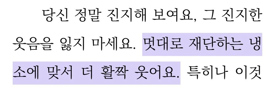 어쨌든 살면서 가장 존중하고 싶은 가치는 선함이니까 그러니깐 나도 냉소에 웃어 보이는 품위를 가진 어른이 되자고 또 다짐하는 거다.