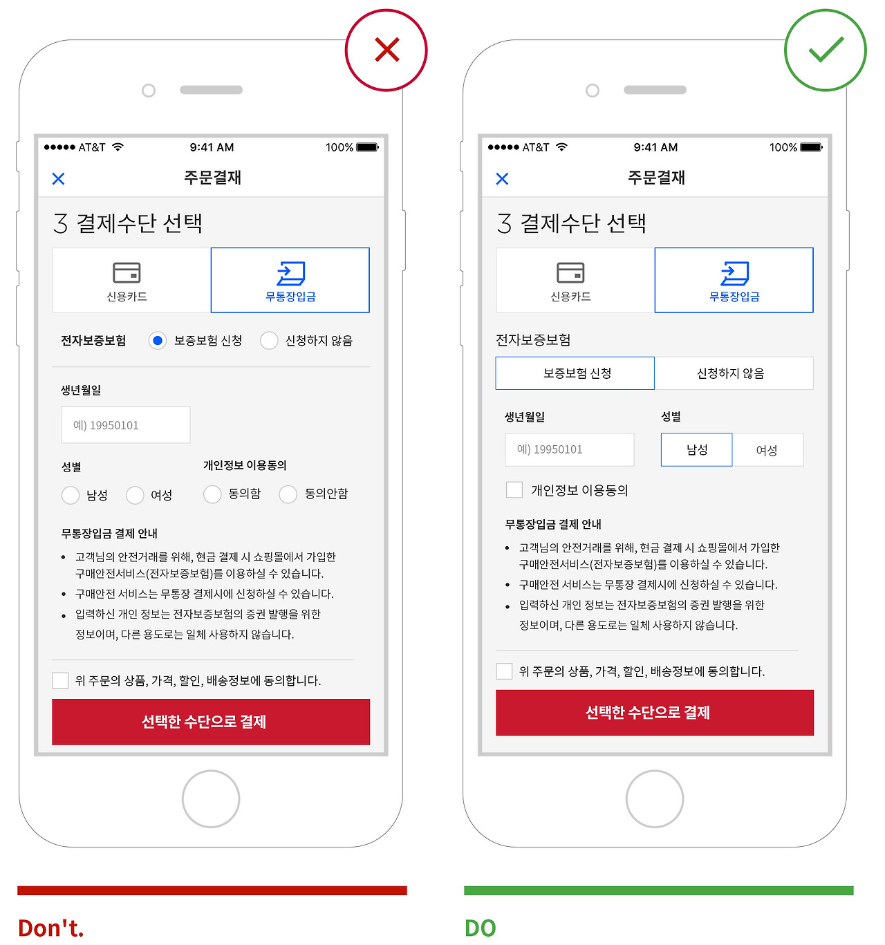 라디오 버튼 항목 안에 다른 라디오 버튼이나 체크박스나 입력 필드 등 다른 옵션을 만들지 않아야 합니다. 모든 라디오 버튼 옵션은 선택과 관련된 하나의 레벨로 디자인되어야 합니다.