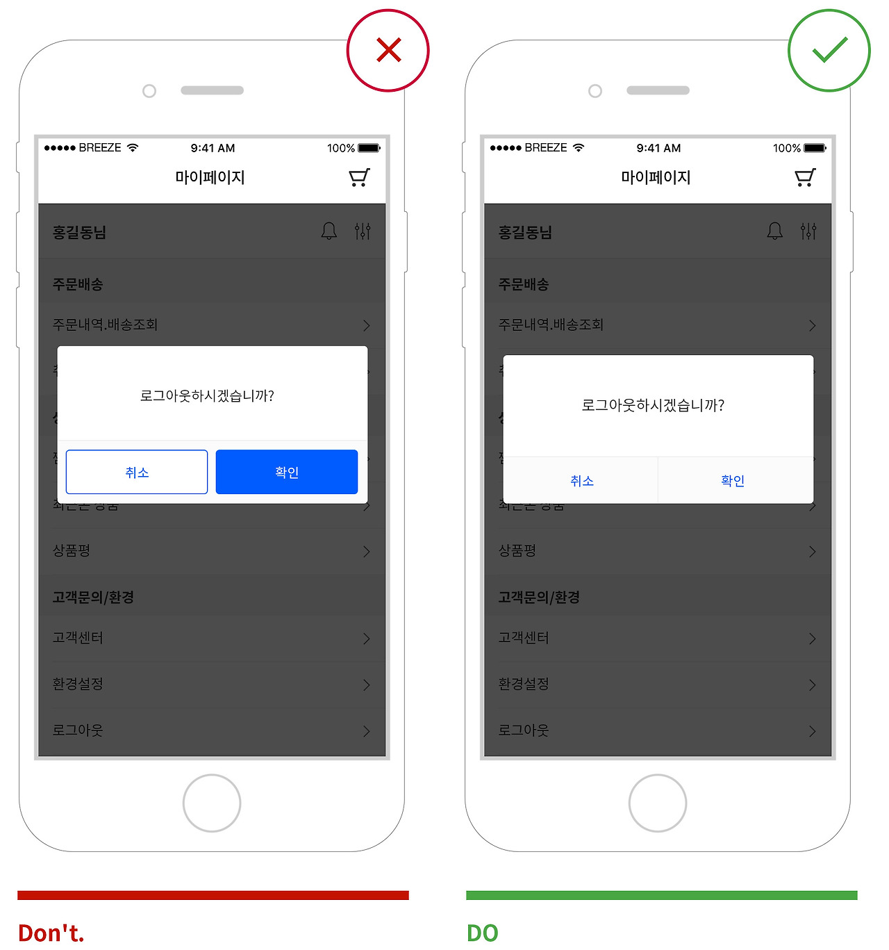테두리나 면으로 된 버튼은 랜딩페이지의 CTA버튼 같은 중요한 경우에만 사용할 것을 권장합니다. 그 외에 경고창 같은 화면에서는 텍스트 버튼 사용을 권장합니다.